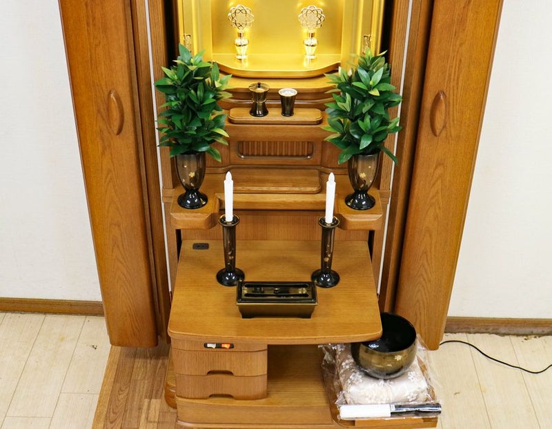 仏具つきをお選びの場合は、銅器生産で有名な高岡産の彫金入り銅器仏具セットが付属いたします。