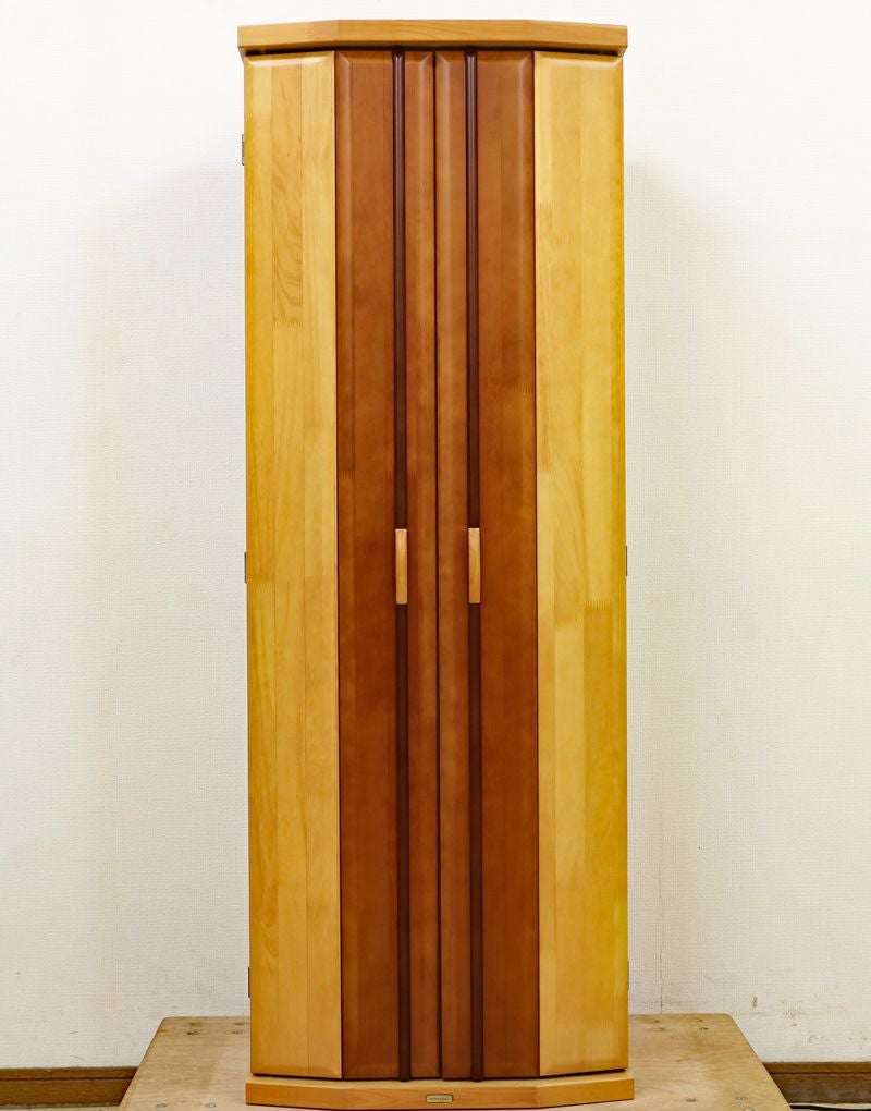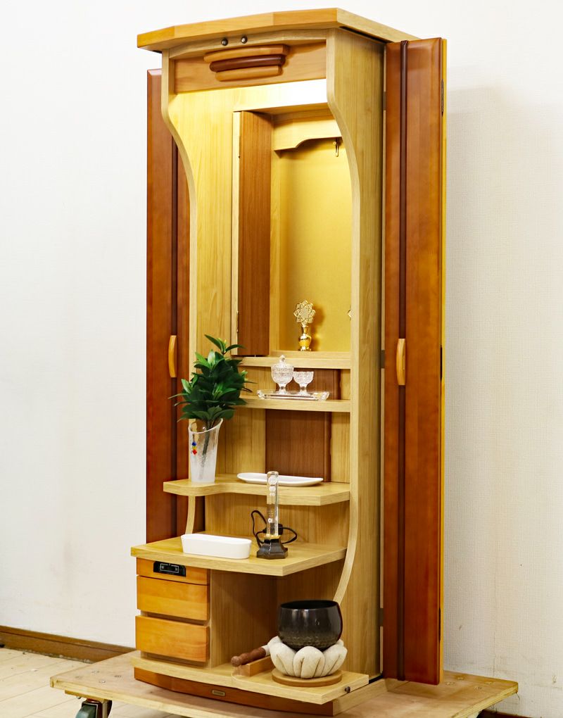 現在金剛堂で仏具付き価格247,530円で販売中の145アンサンブルの中古仏壇です。ダーク色とライト色のツートンのコンビネーション色です。今までのお仏壇のデザインではなかった、オシャレな雰囲気漂うデザインに仕上がっております。押し込み式大戸ですので、押し込むことで斜めからもご本尊様を拝すことができます。