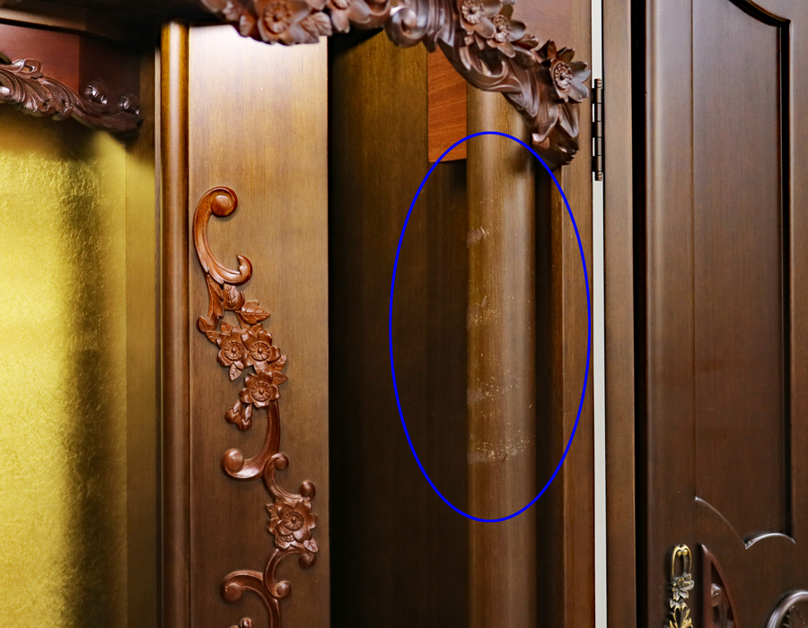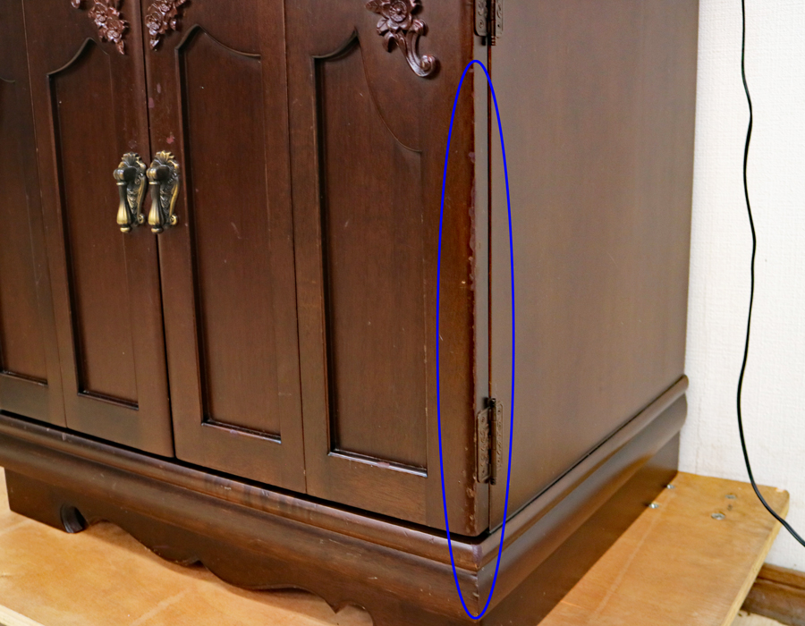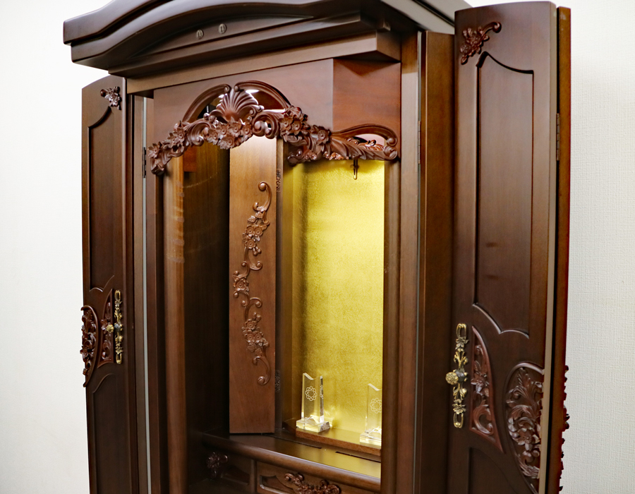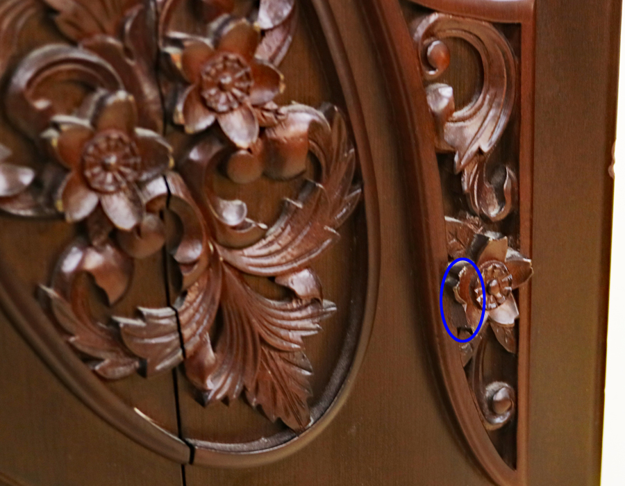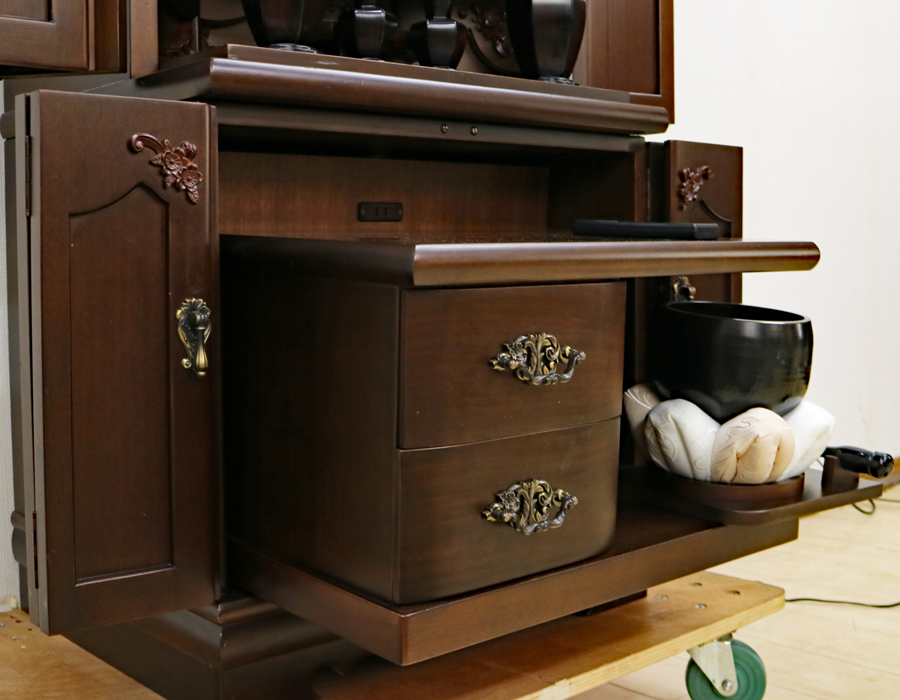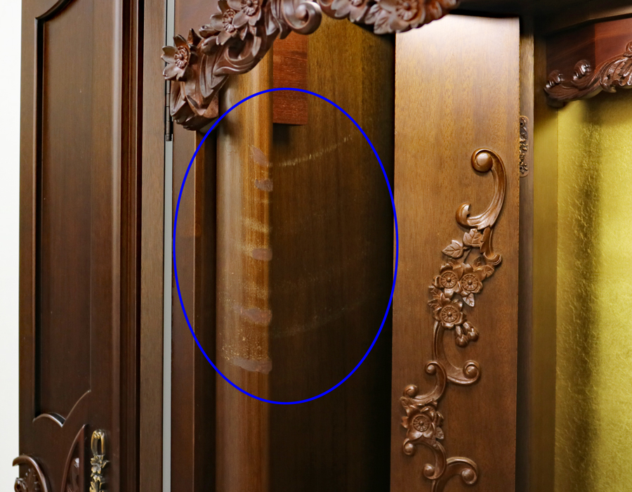 傷が多数見られるためB級仏壇として格安にてご提供させていただきます。大戸は、三方開きにすることができ、お厨子の視野が広がり斜めからでもご本尊様を拝すことができます。