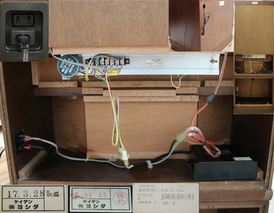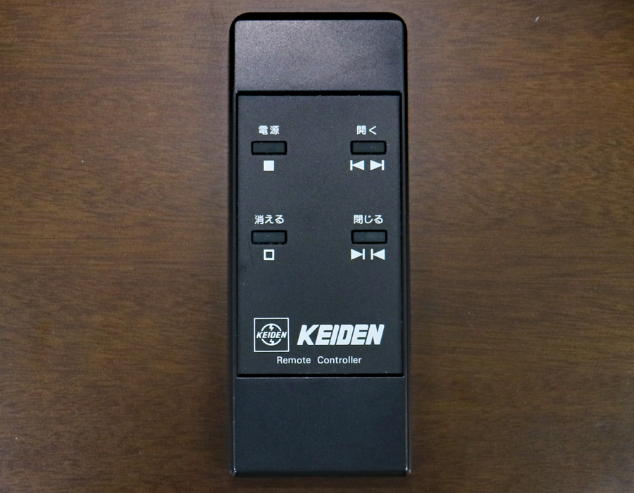 上記お写真のリモコンで電動厨子扉の開閉、電源の入り切りを行います。