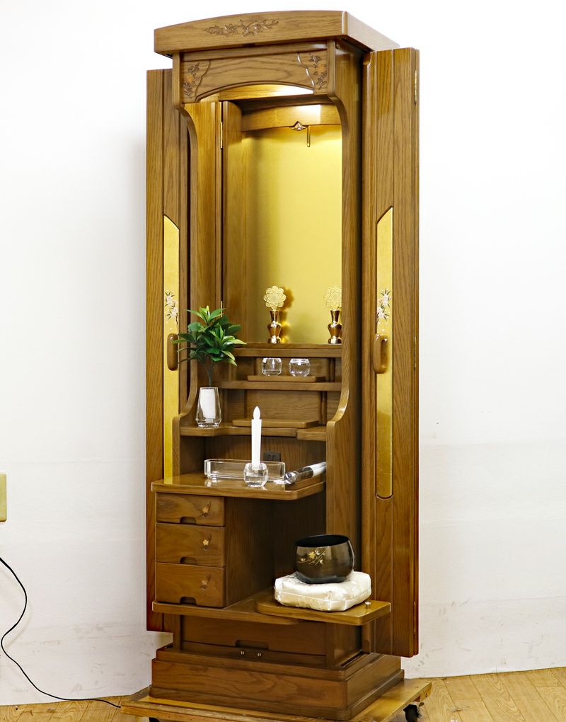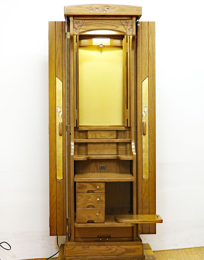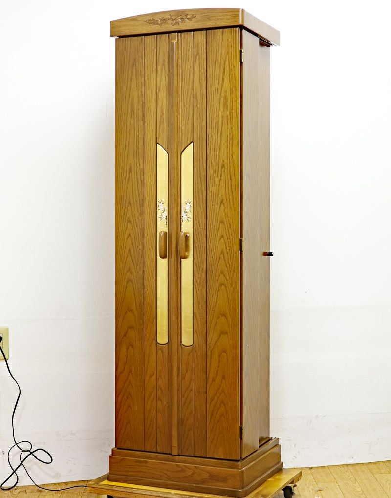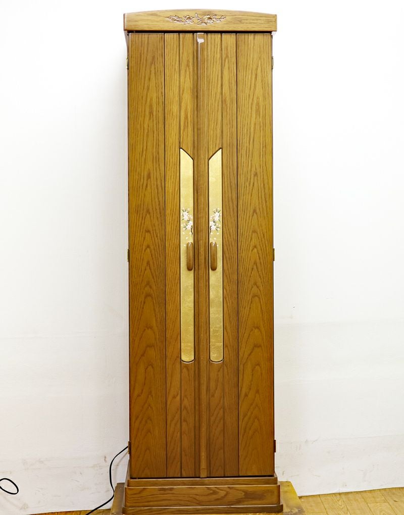特別仕様の家具調中古仏壇の登場です。大戸に金箔風のデザインが入ることでより高級感の増すデザインとなっております。押し込み式大戸ですので、押し込むことで斜めからもご本尊様を拝すことができます。リモコンの反応が悪かったため受信機を新品と交換いたしました。