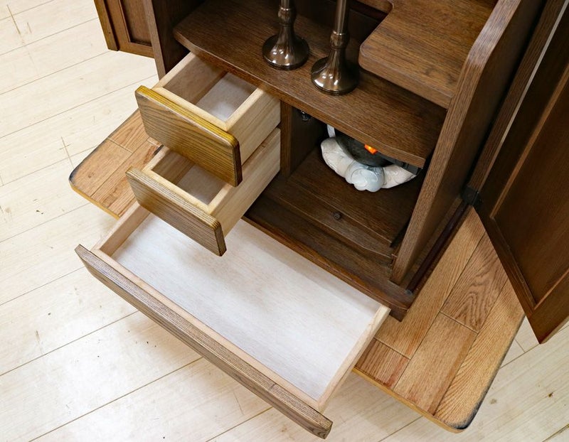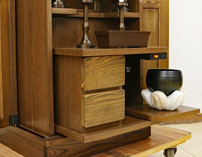 なら材を多用している家具調仏壇です。押し込み式大戸で斜めからもご本尊様を拝すことができますので会場、拠点でもご利用いただけます。アンチークな雰囲気の有る仏壇ですので大切にお使い板でける方に是非ともご検討頂けますようよろしくお願い申し上げます。