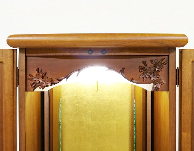 落ち着いた木のやさしさを感じるお仏壇です。無垢板を使用しているので、年数とともに色合いが変わり味が出てきます。婦人部女子部に大人気の商品です。扉が2箇所に分けられていますので、厨子だけ開閉ができスマートにご安置できます。洋室・一人暮らしにも最適です。