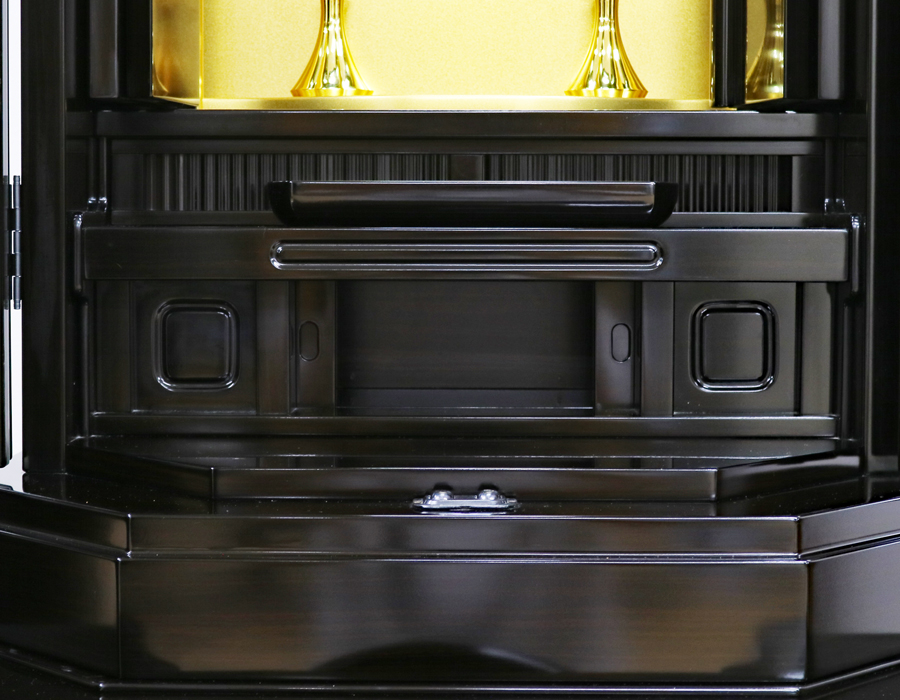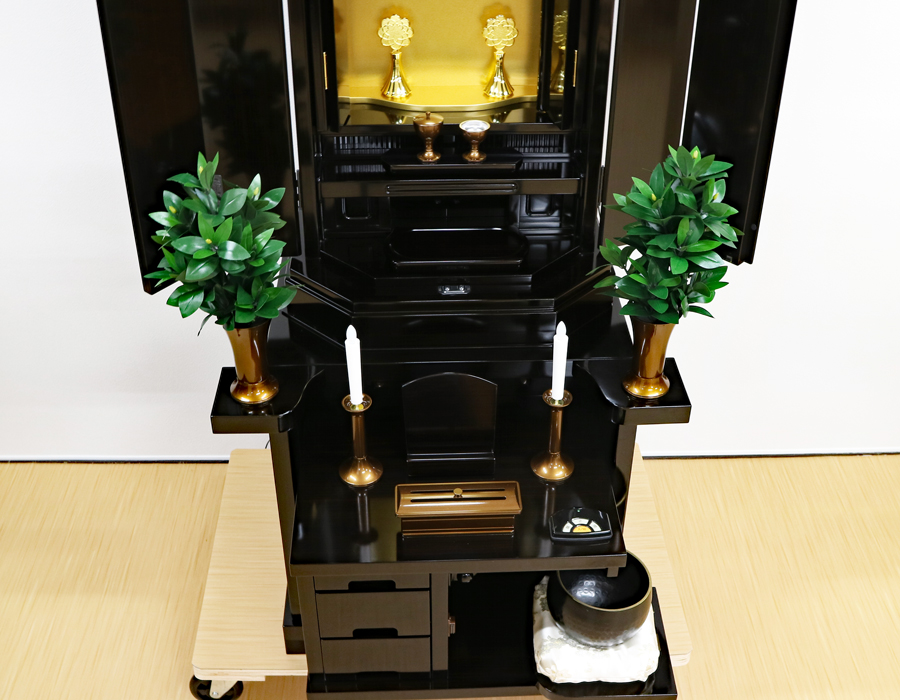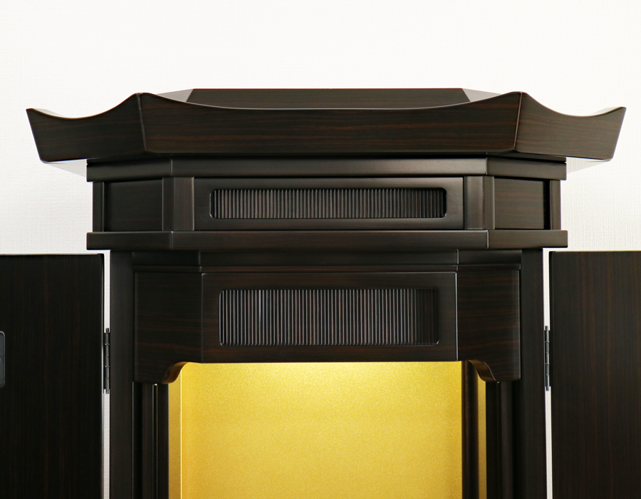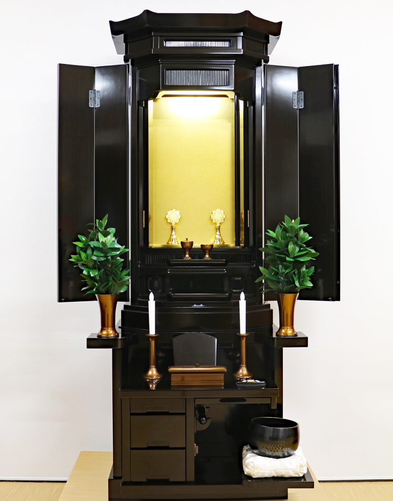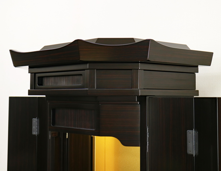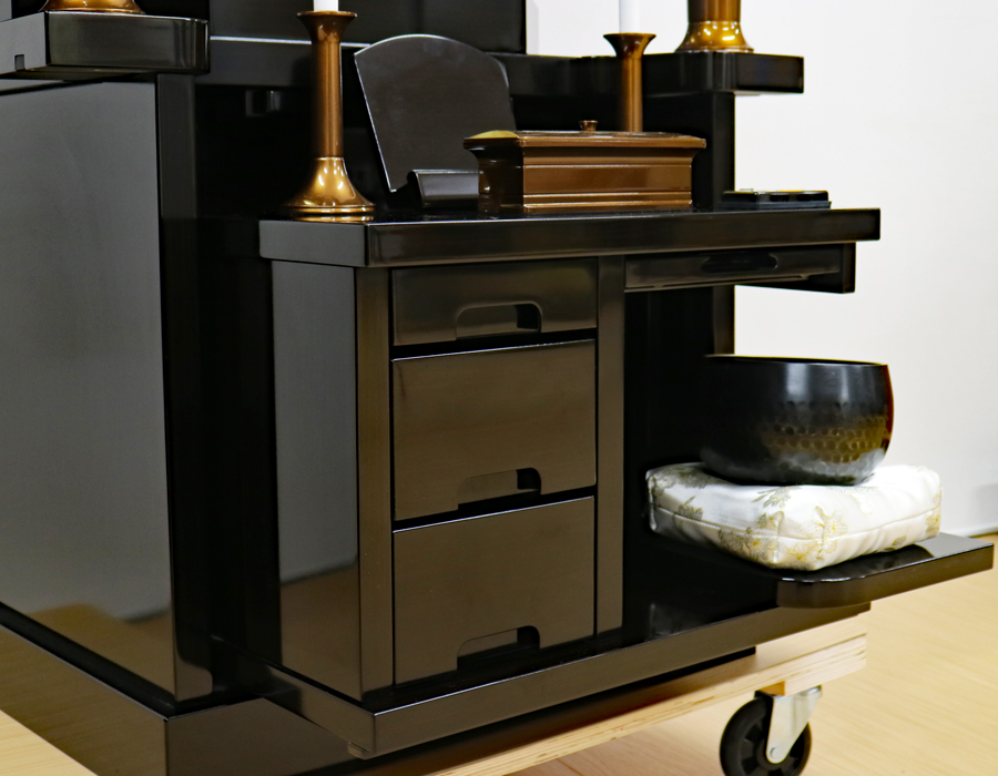 このお仏壇は厨子型収納仏壇の中でデザイン・サイズなどから1番人気の仏壇です。最近ではイスでの勤行・唱題にも