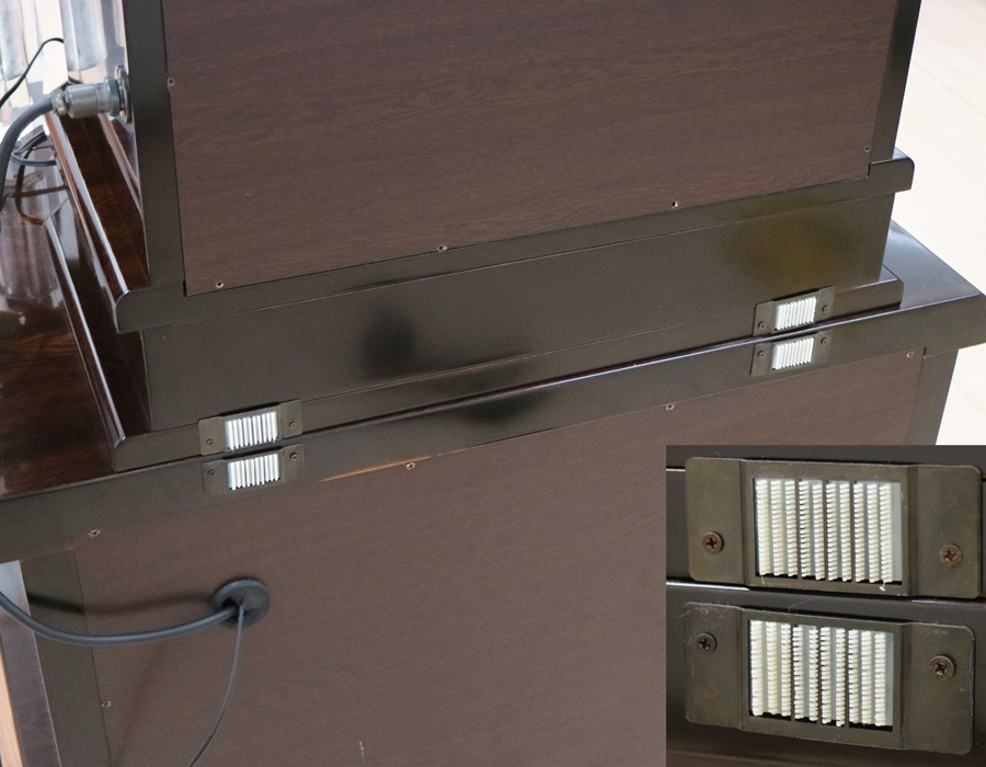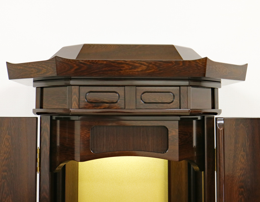 お仏壇背面の屋根の部分と上台下台の間に、耐震金具が設置されております。