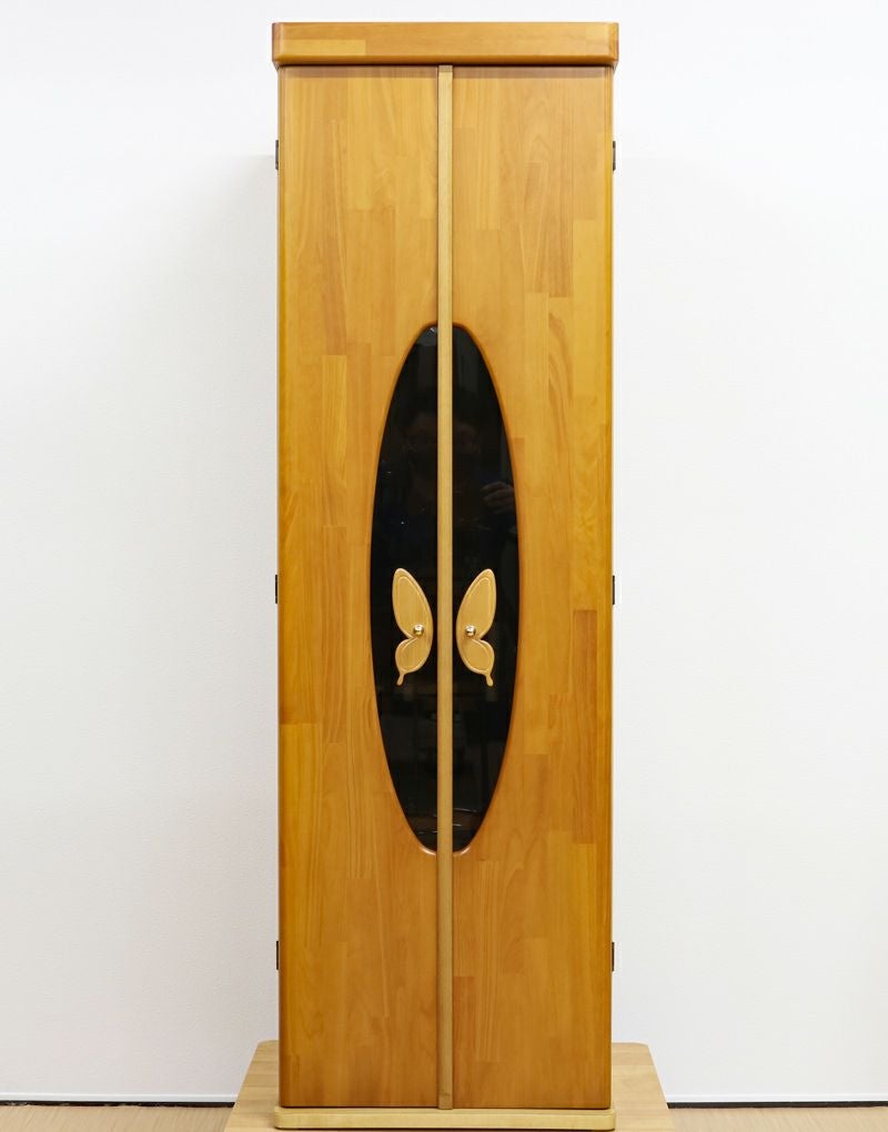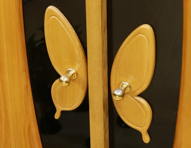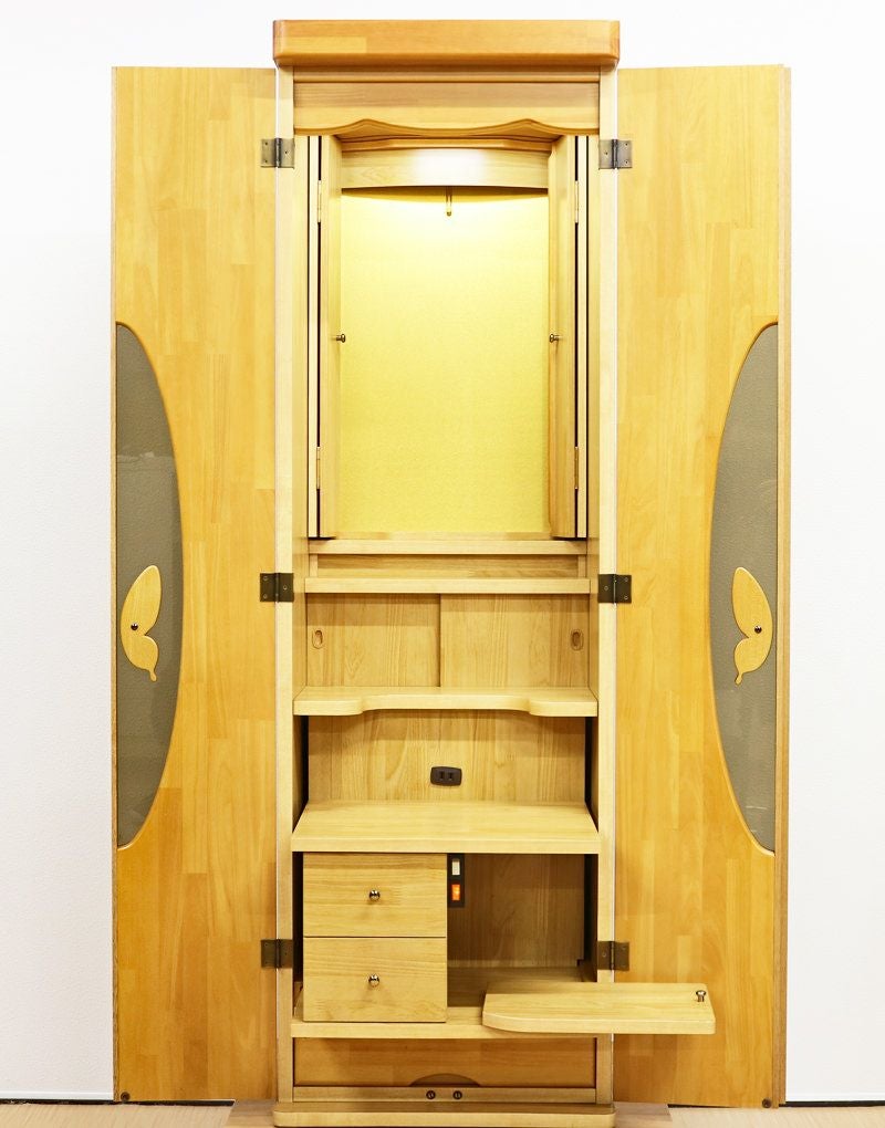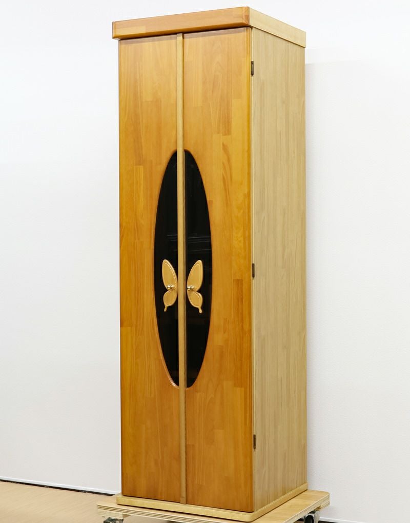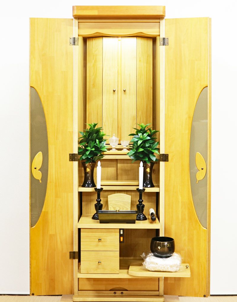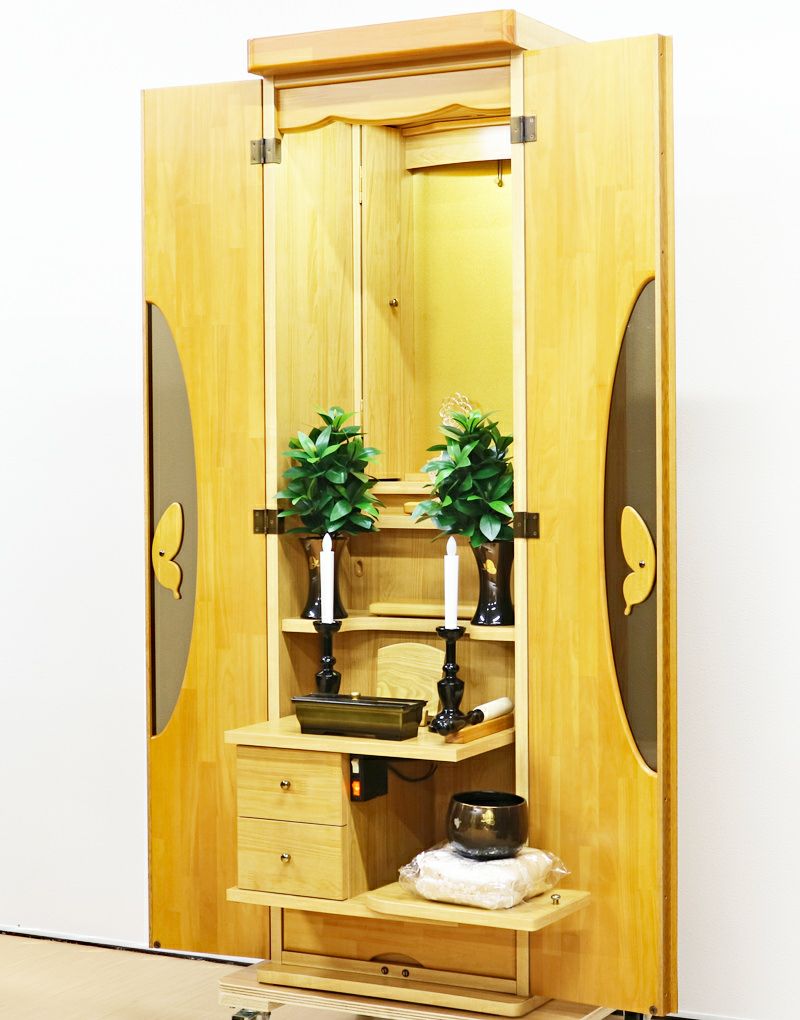 蝶をモチーフにデザインされた、おしゃれな取っ手デザインが特徴の中古仏壇です。コンパクトでワンルームでも安心の家具調電動仏壇です。お買い求めしやすい現金大特価でご奉仕品として販売させていただきます。照明をLED照明に当店にて交換いたしました。