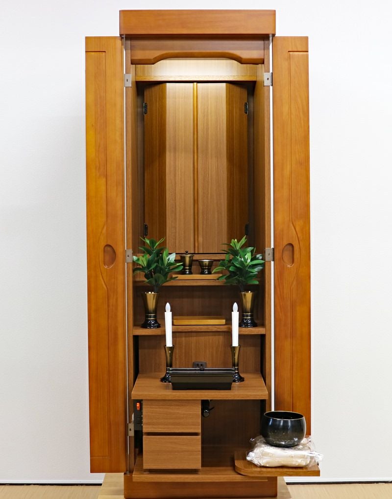 現在も当店にて新品仏具付き価格230,000円にて販売中の「ポピー」の中古仏壇です。コンパクトでワンルームでも安心の家具調電動仏壇です。新品はこちら