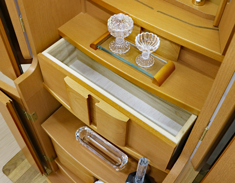 金剛堂製の二段重ねの家具調中古仏壇です。大扉と厨子扉の中央にすりガラスが施されているスマートなデザインも特徴的です。和室・洋室・リビングダイニングにも最適です。使用感も少なくとてもきれいです。