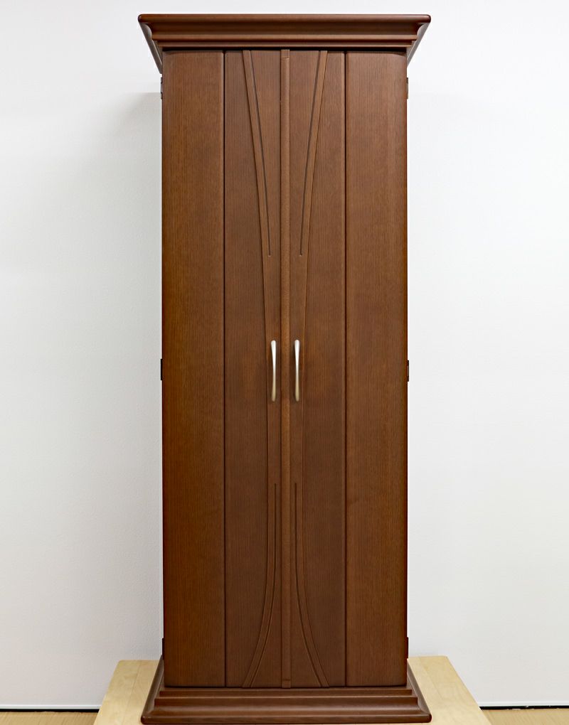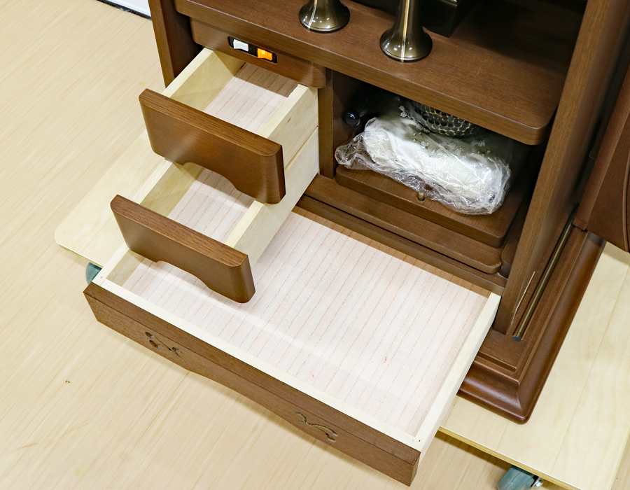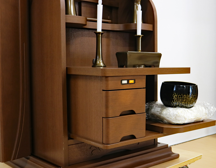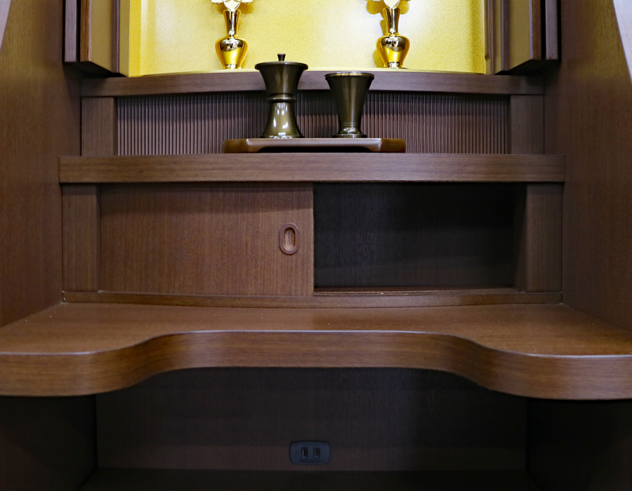 オーク色の押し込み式大戸ですので、押し込むことで斜めからもご本尊様を拝すことができますので会場・拠点用にも対応できます。またイスをお使いの方でもご本尊様の高さに見合いますのとても使い勝手の良い家具調仏壇として人気商品になっています。
