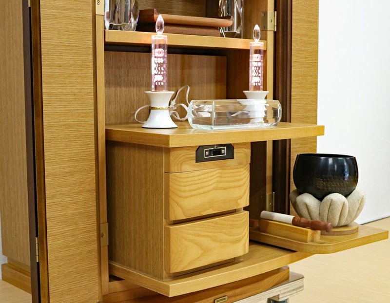 金剛堂製の二段重ねの家具調中古仏壇です。タモ材を使用した、スマートなデザインも特徴的です。和室・洋室・リビングダイニングにも最適です。使用感も少なくとてもきれいです。