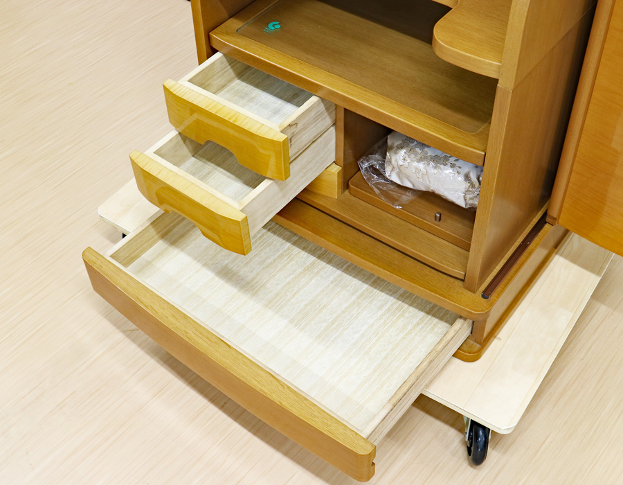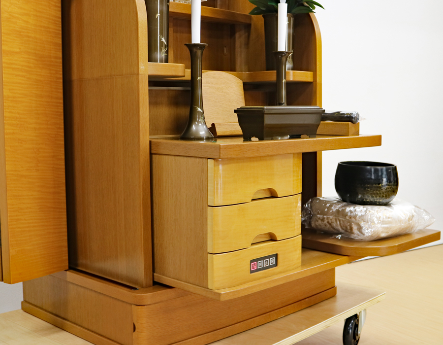 収納経机にに引き出しが3か所ございます。 お念珠・お教本・お線香・大白蓮華・短冊なども余裕をもって収納できます。