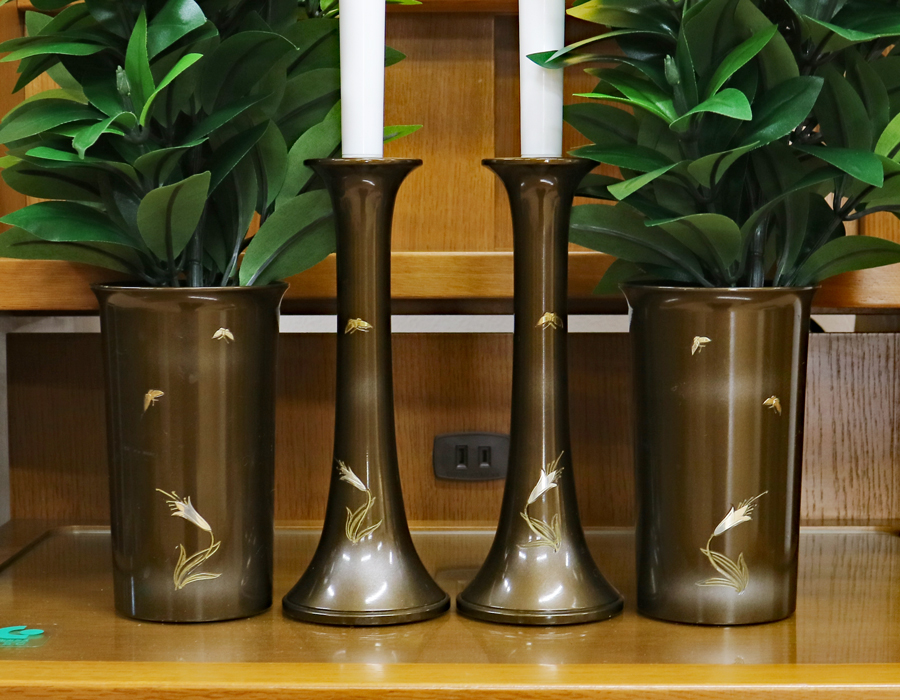 仏具付きをお選びの方は、上記お写真の彫金入りの仏具セットが付属いたします。