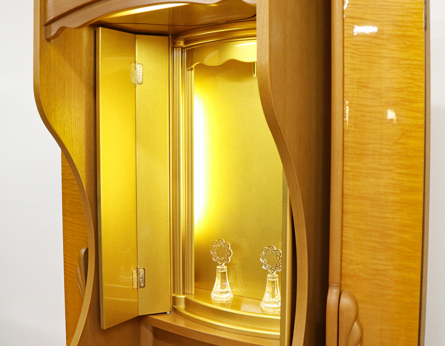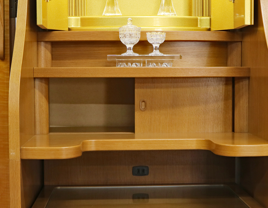 本商品は上部(10w)だけでなく、両脇にも蛍光灯15w照明が設置されている、彩光厨子を採用しておりますので、ご本尊様を明るく拝すことが出来ます。