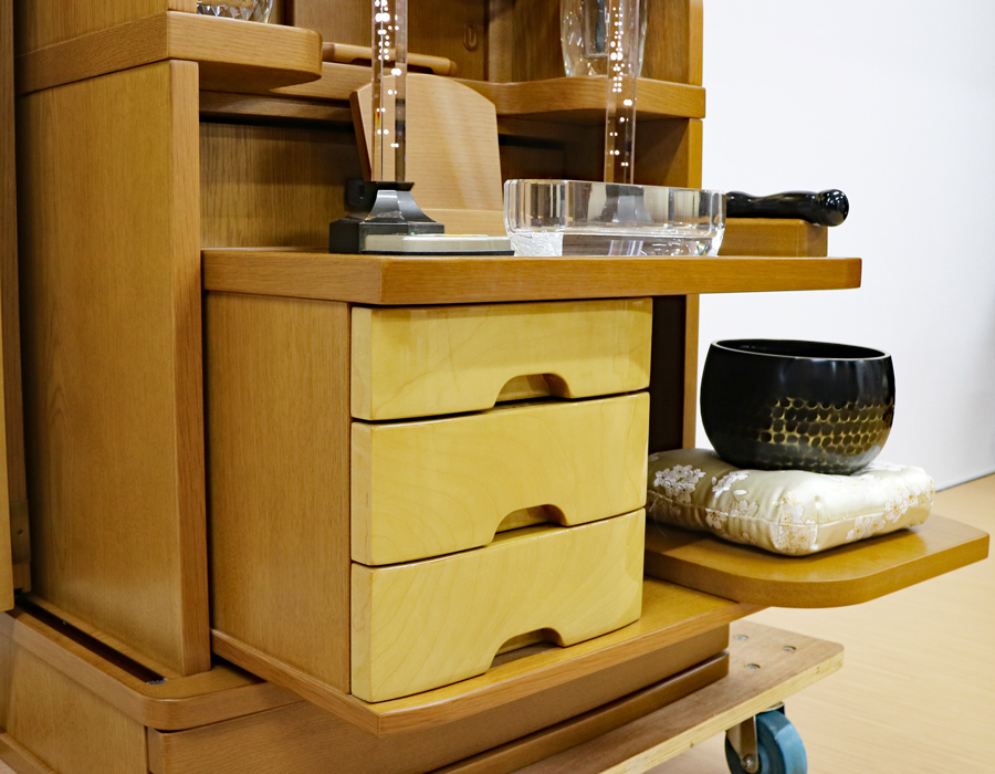 収納経机にに引き出しが3か所ございます。 お念珠・お教本・お線香・大白蓮華・短冊なども余裕をもって収納できます。