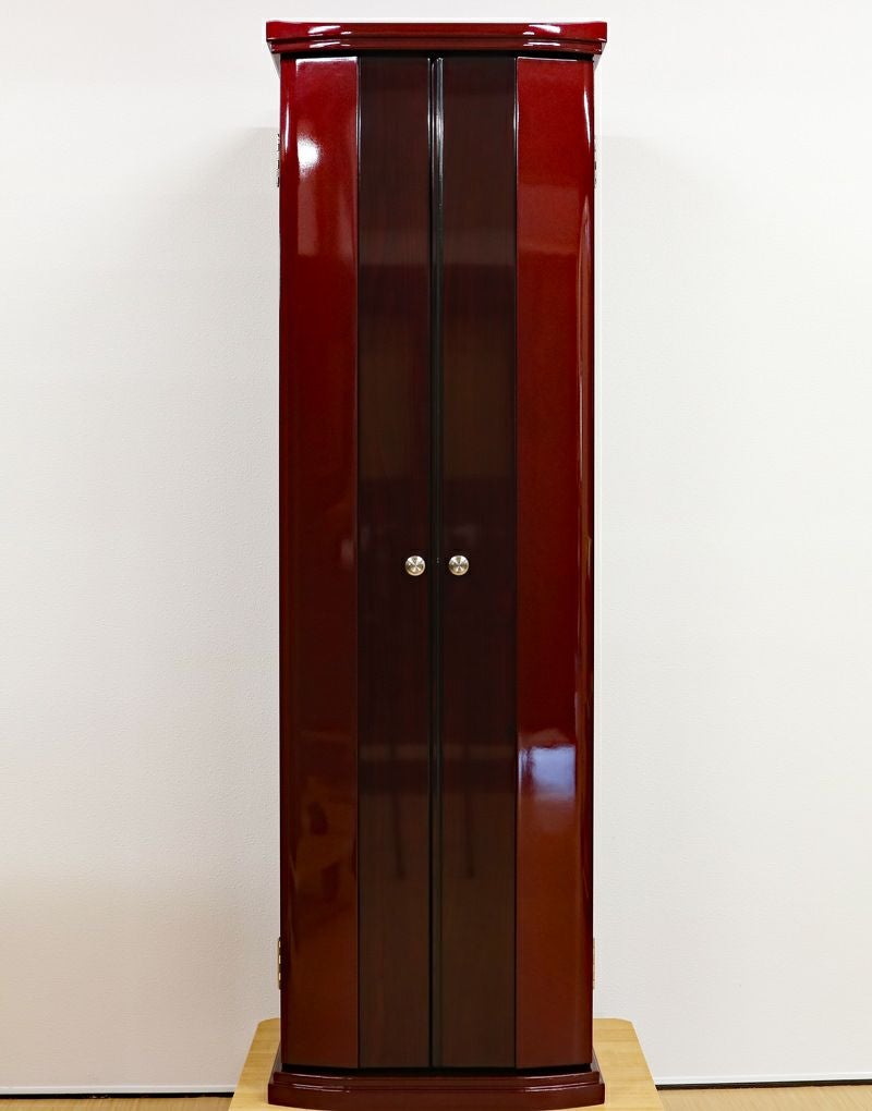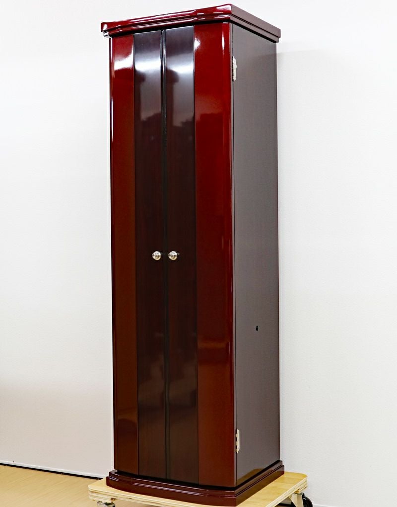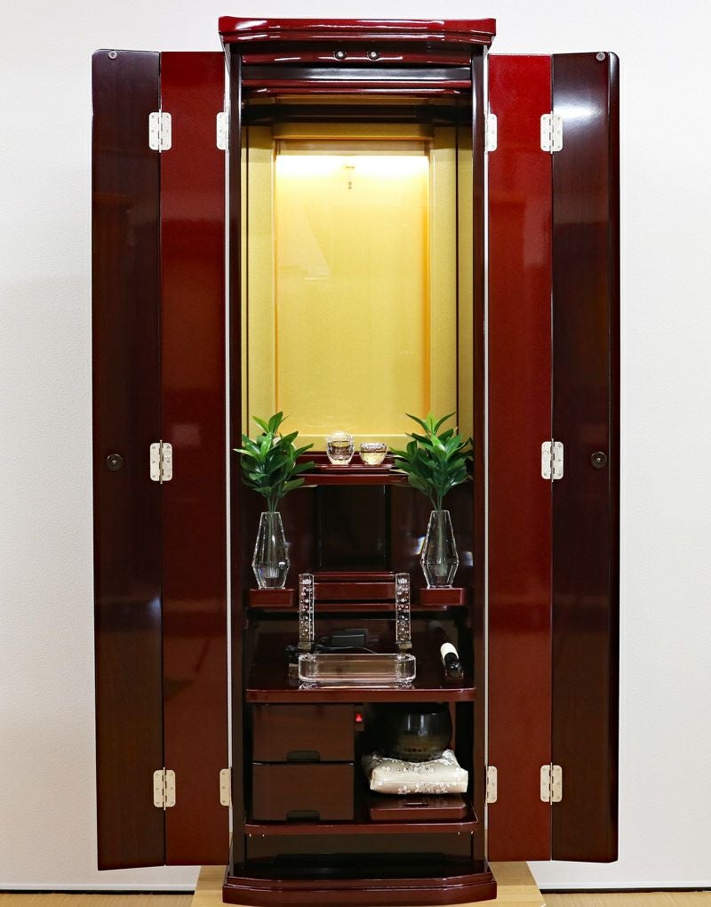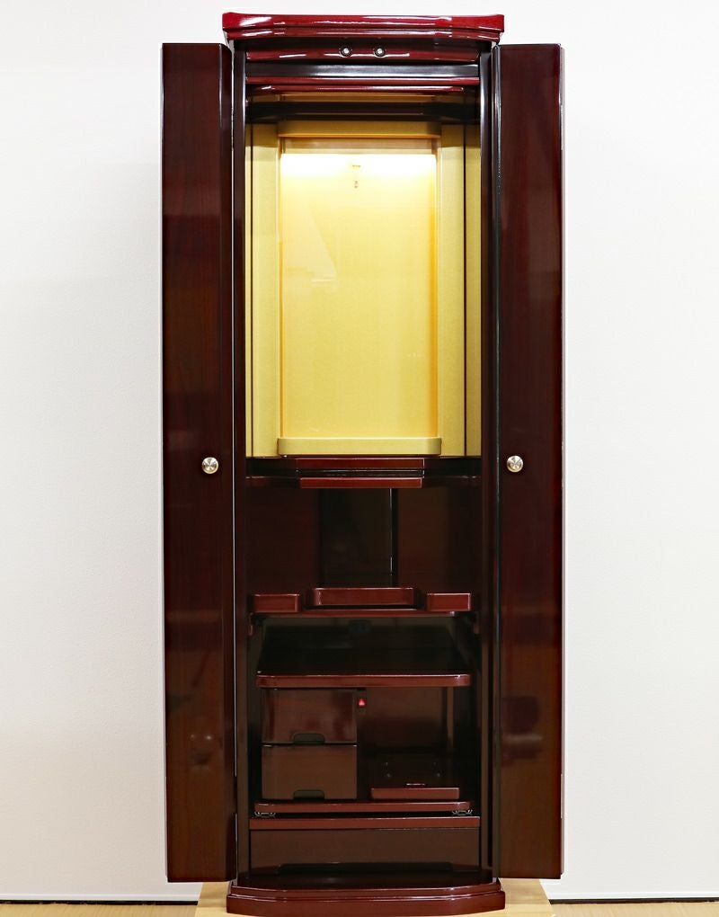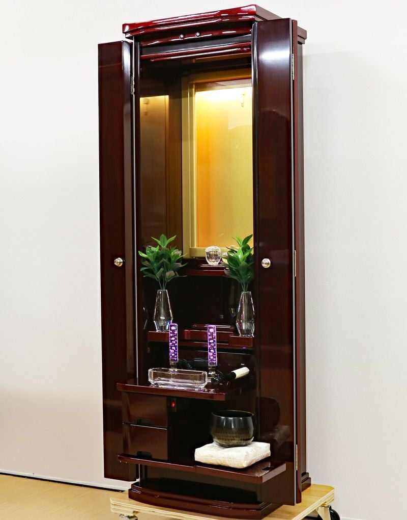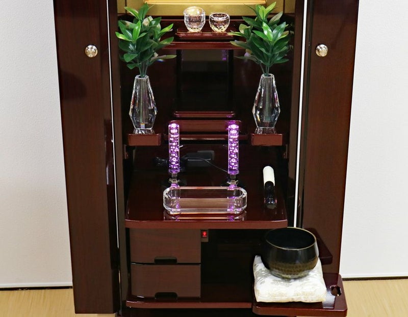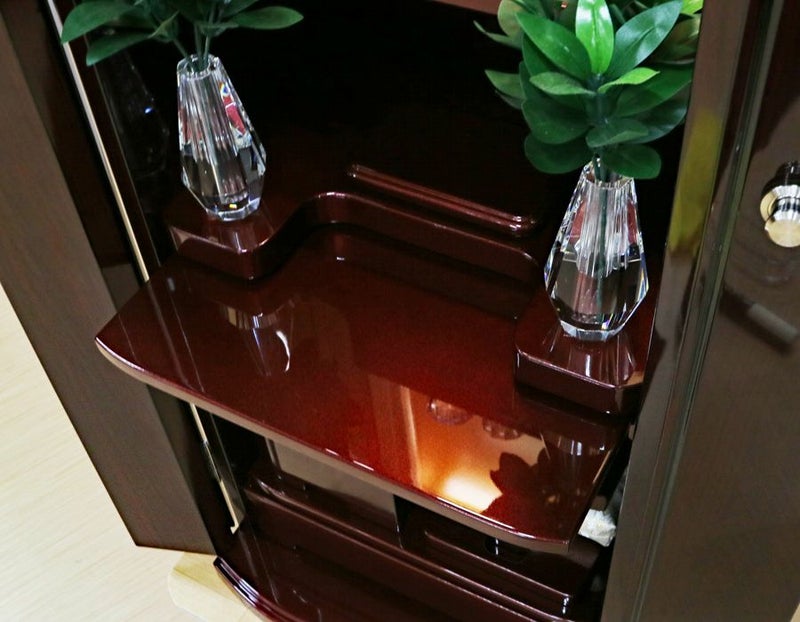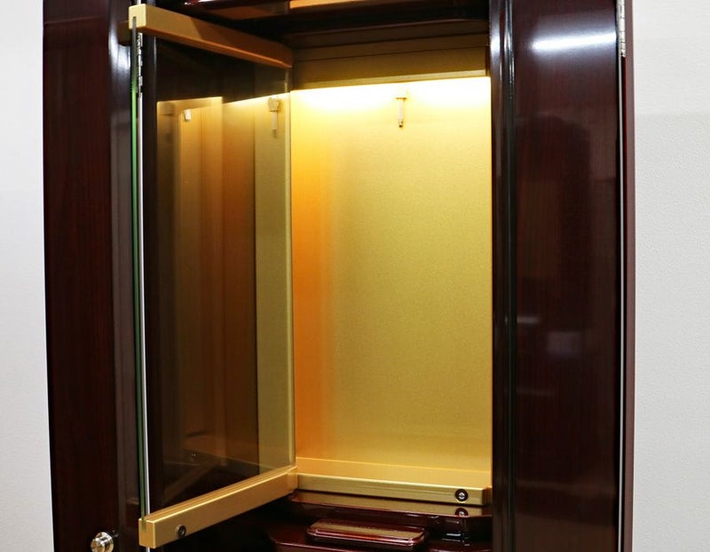 強化ガラス仕様の高級感あるの家具調中古仏壇になります。製造から約4年の状態のいい商品になります。紫檀色とワインレッドのツートンカラーでおしゃれに洗練されております。軸回転式強化ガラス厨子を採用しておりますので、開閉が簡単で拭いても傷がつきにくくお手入れがしやすいのが特徴です。