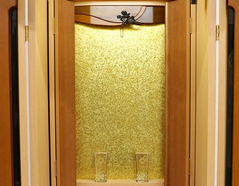 13年前に製造された金剛堂製の家具調中古仏壇アップルリーフです。厨子上部にある桜の彫刻はオシャレな雰囲気漂うデザインに仕上がっております。和室・洋室・リビングダイニングにも最適です。三方開きにするとお厨子の視野が広がり