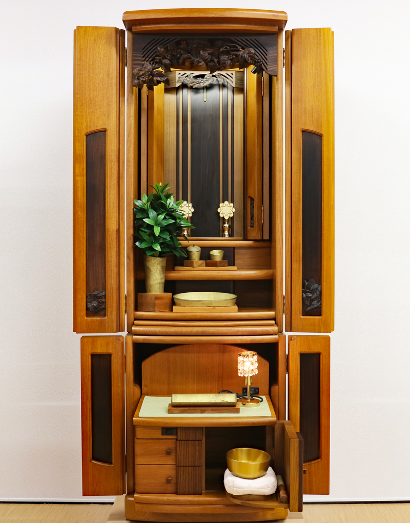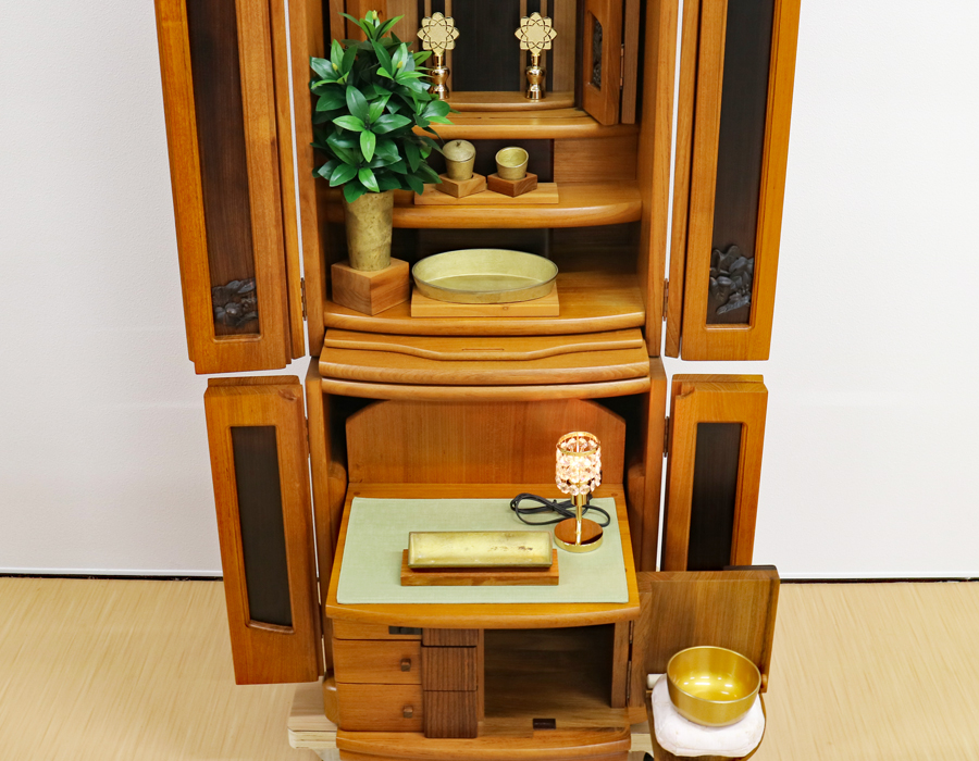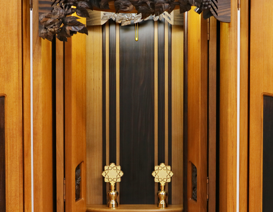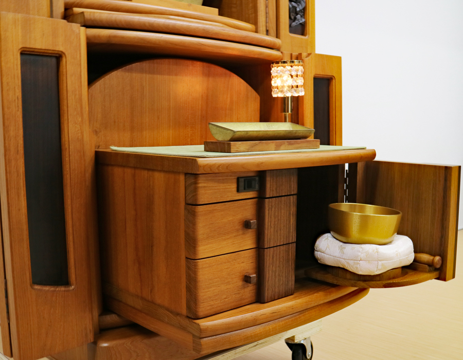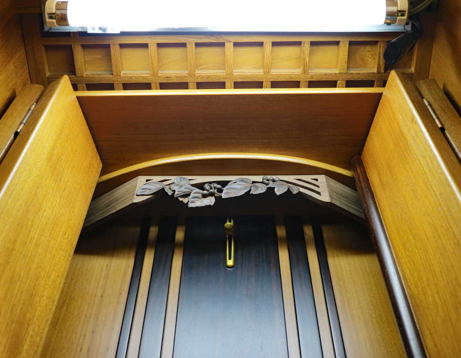 大戸が三方開きになるお仏壇ですので、三方開きにすると視野が広がり斜めからでも御本尊様を拝すことができます。