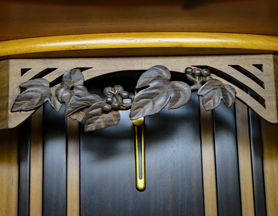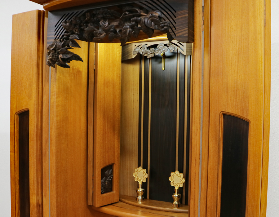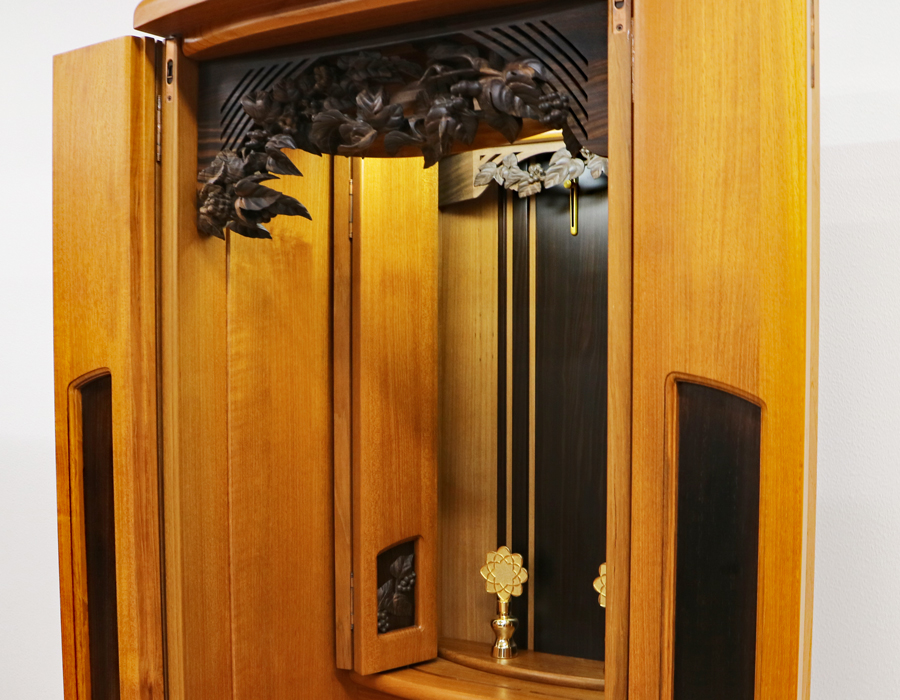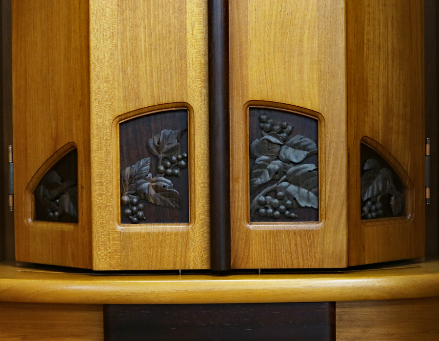 欄間同様に、厨子扉にも本黒檀無垢の野ブドウの彫刻が施されております。