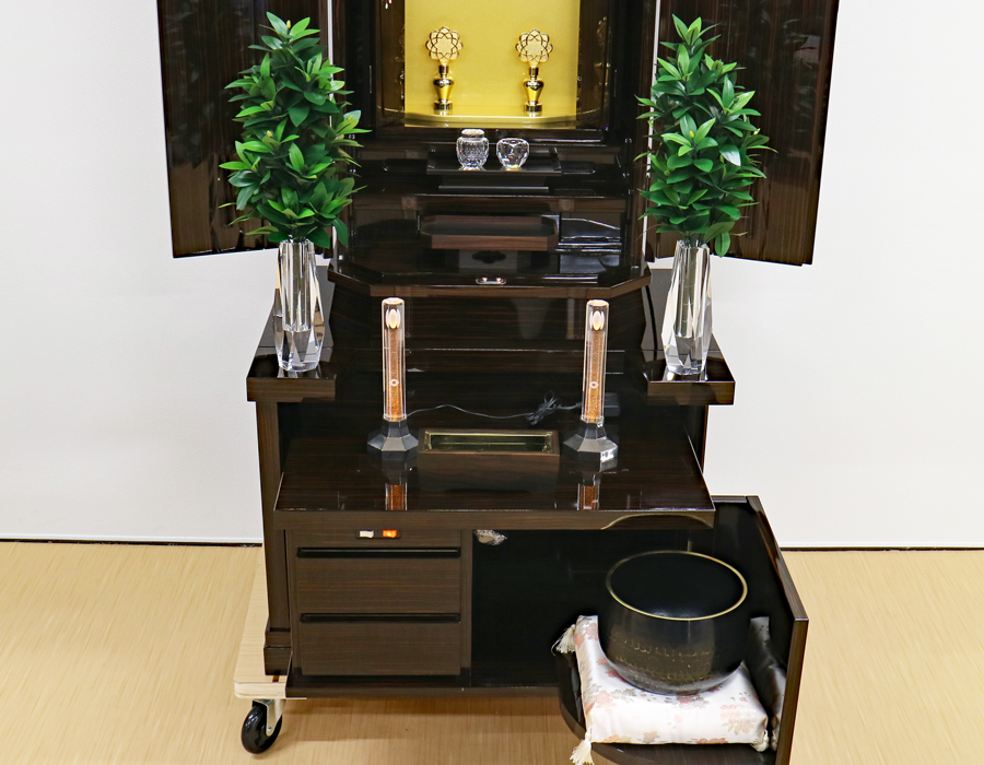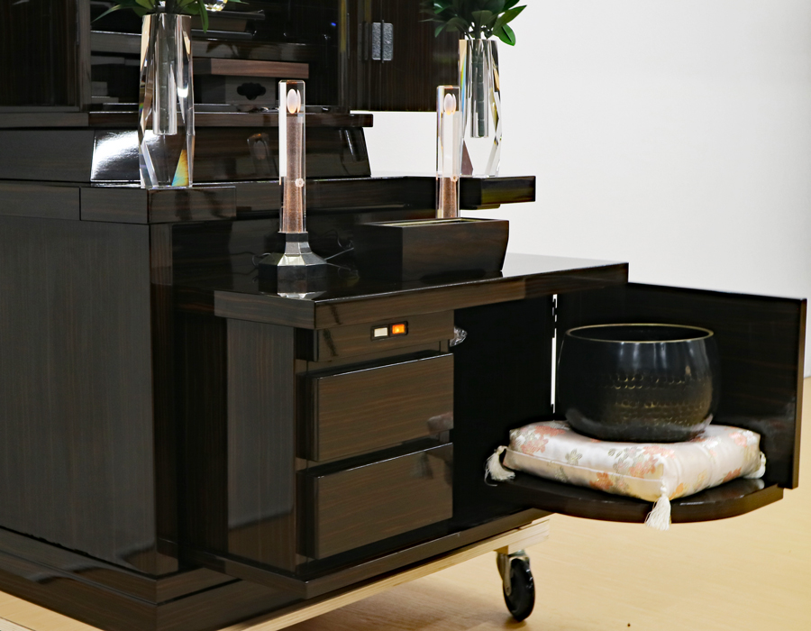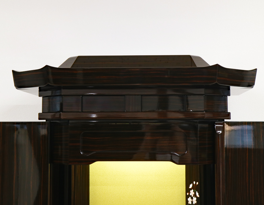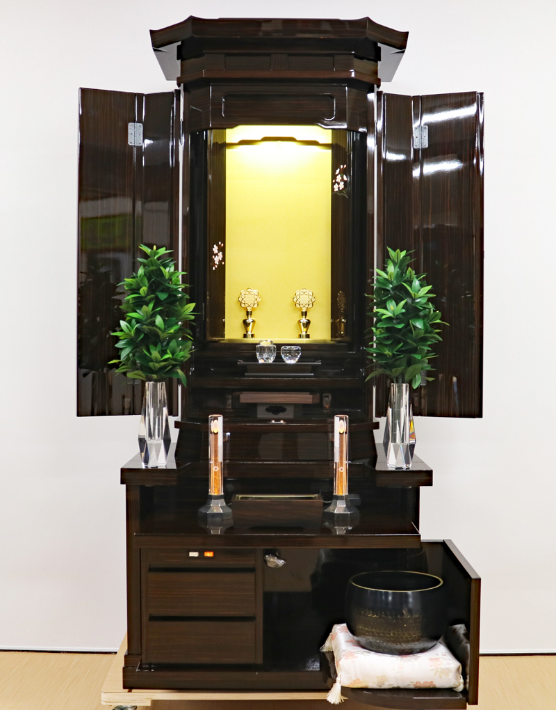 黒檀色の光沢仕上げの高級感あふれるデザインの本格厨子収納型仏壇になります。