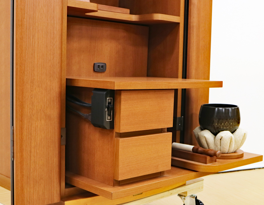 大戸・厨子扉のツートンカラー、厨子上部にある黒檀を使用した桜の彫刻はオシャレな雰囲気漂うデザインに仕上がっております。