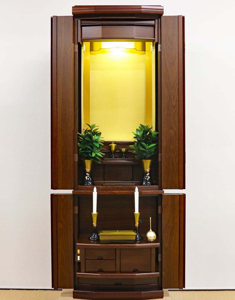 素敵でシックなウォールナットの色調、厨子下からの照明でご本尊様をライトアップ、まさしく虚空絵の儀式さながらにご本尊様を荘厳に演出しています。自動開閉もスムーズですのでお買い得、お仏壇の買い替えに最適です。お引き取り仏壇がある場合は三辺サイズをお知らせくださいませお見積もりさせていただきます。中古仏壇は一期一会です。ピンと命に響いたら即決で購入してください。現在でも当店にて新品仏具付価格358,000円で販売中の「ブランチ ウォールナット」の中古仏壇です。新品はこちらをクリック