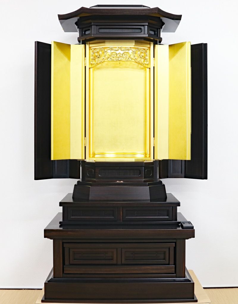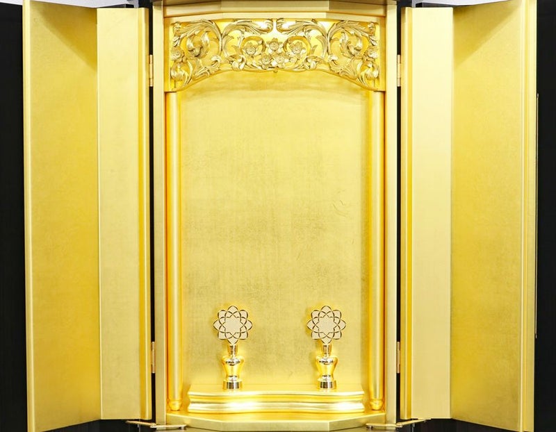本金箔と金色塗装では輝きが違うのは一目瞭然です。 内部には蛍光灯6wの照明も付属していますのでご本尊様を明るく照らしてくれます。