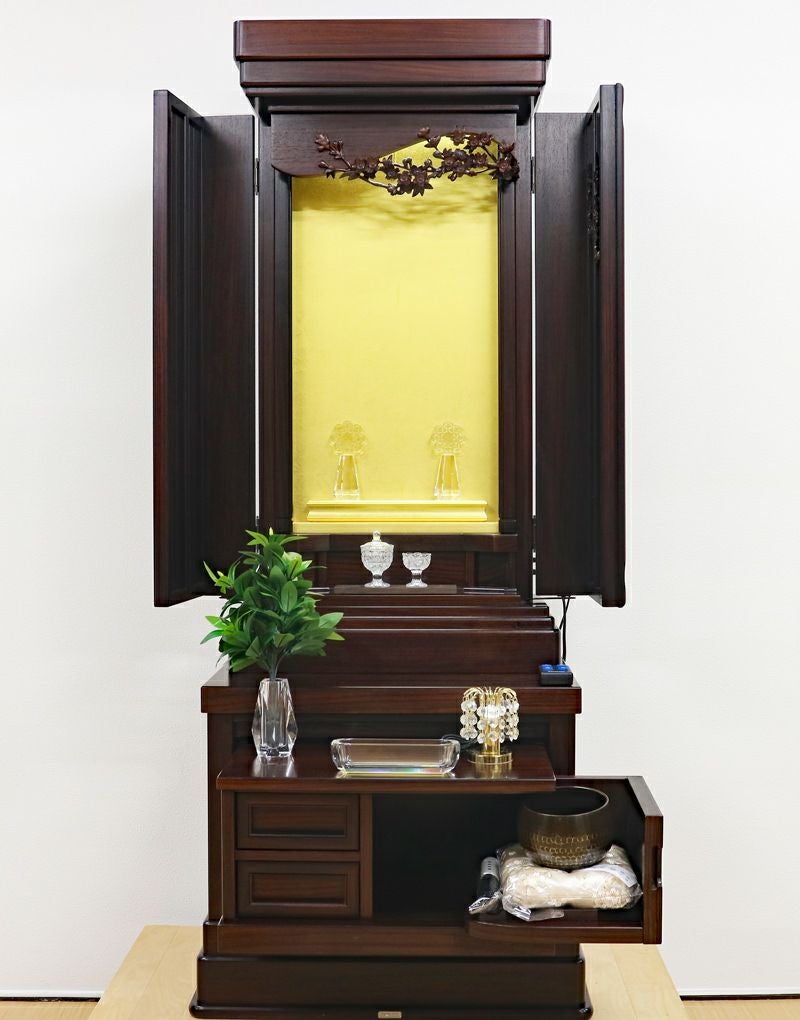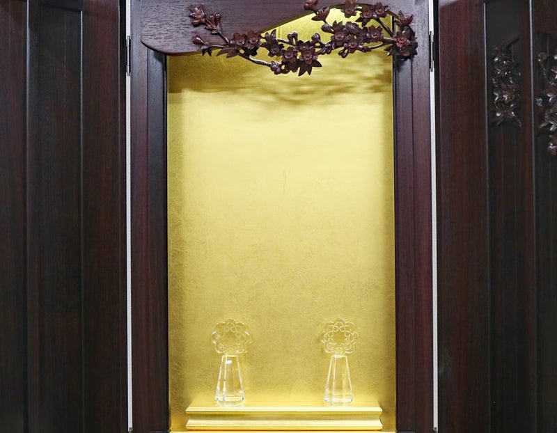 本金箔と金色塗装では輝きが違うのは一目瞭然です。 内部には蛍光灯照明も付属していますのでご本尊様を明るく照らしてくれます。