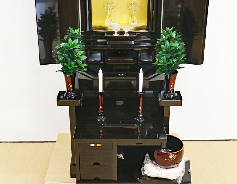 仏具ありを選択の場合、上記お写真の素晴らしい高岡製銅器仏具セットが付属いたします。