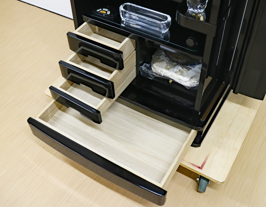 収納経机に引き出しが3か所、その下に広めの引き出しが1か所ございます。 お念珠・お教本・お線香なども余裕をもって収納できます。