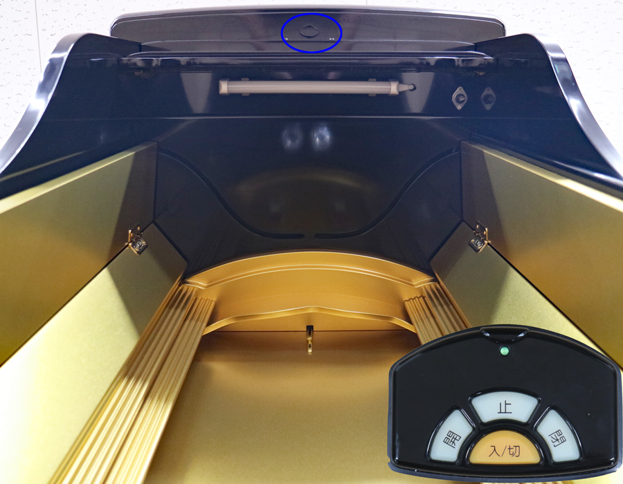青丸の箇所はリモコン受信機になりますので、こちらに向けてリモコンを使用してください。