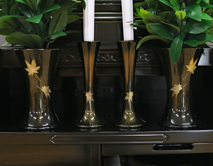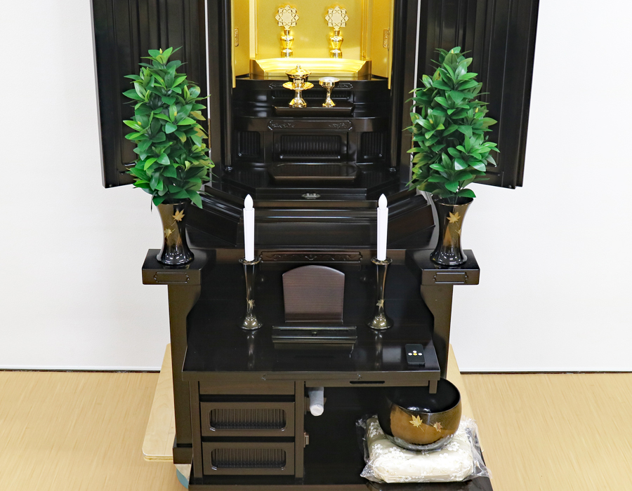 仏具付き選択の場合、彫金の入ったおしゃれな仏具セットが付属いたします。