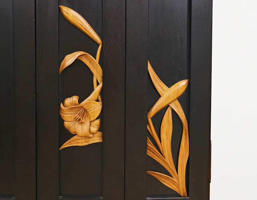 欄間にチーク無垢をふんだんに使用した、洗練された白ゆりの彫刻が欄間にございます。