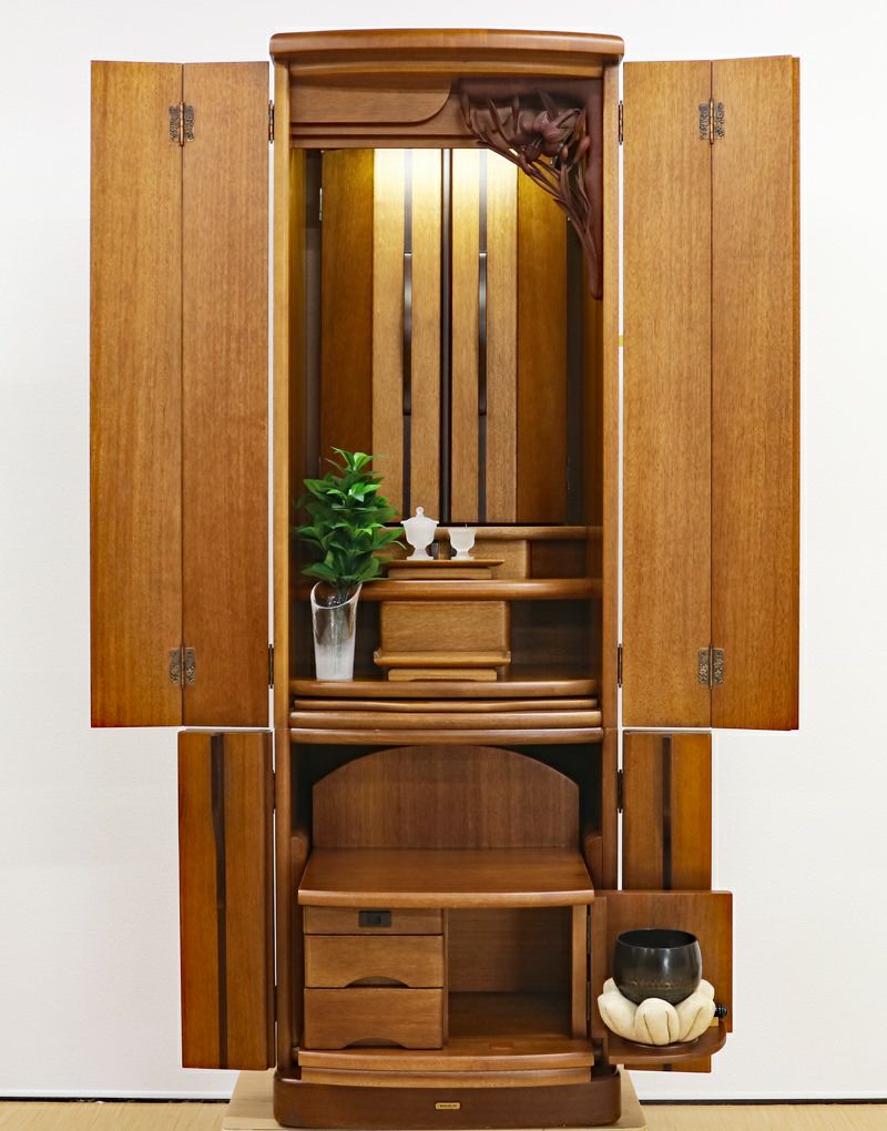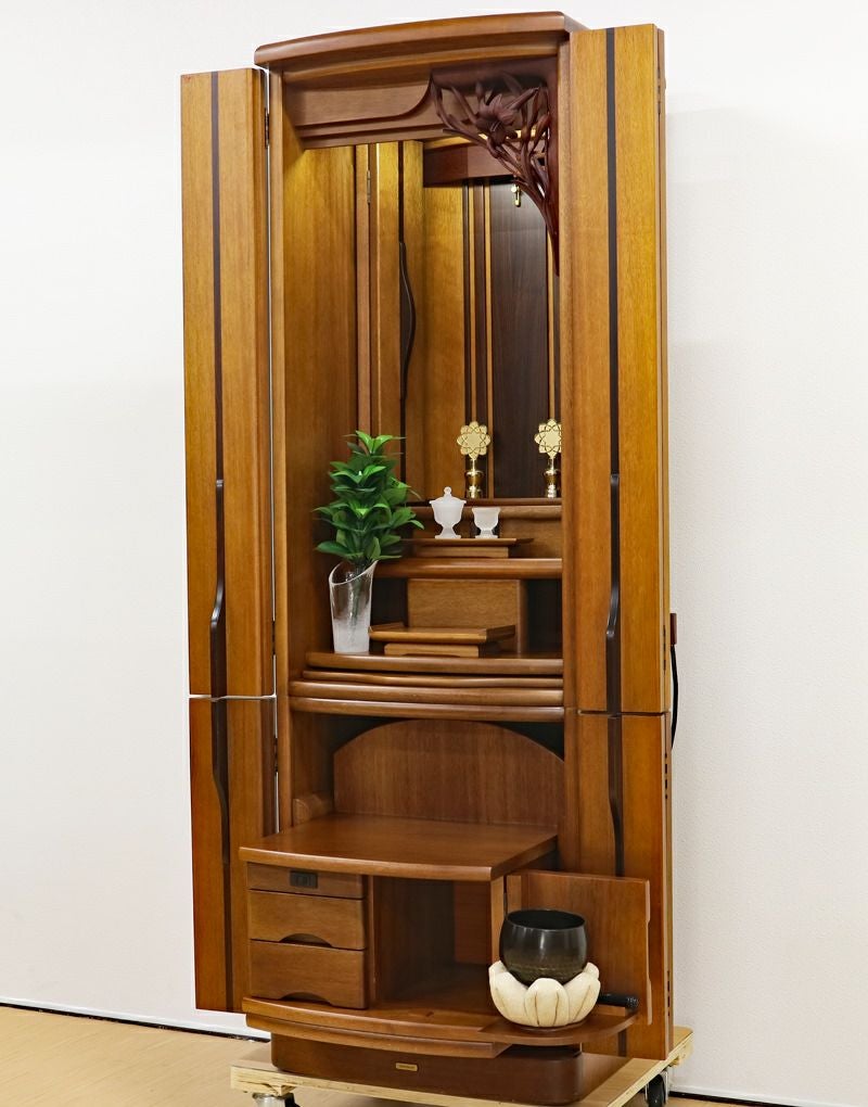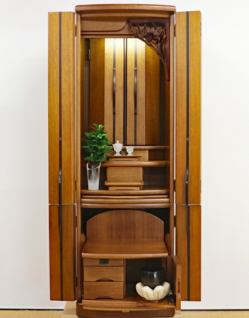落ち着いた木のぬくもりを感じるお仏壇です。扉が2箇所に分けられていますので、厨子だけ開閉ができスマートにご安置できます。洋室・一人暮らしにも最適です。