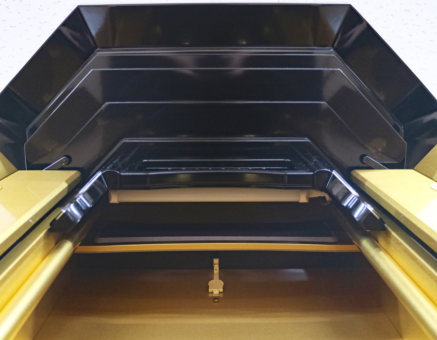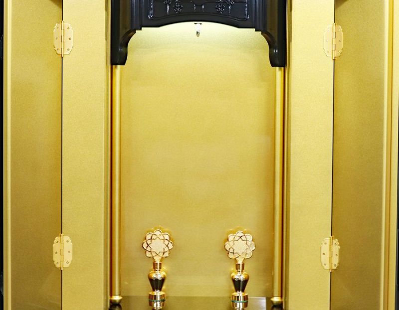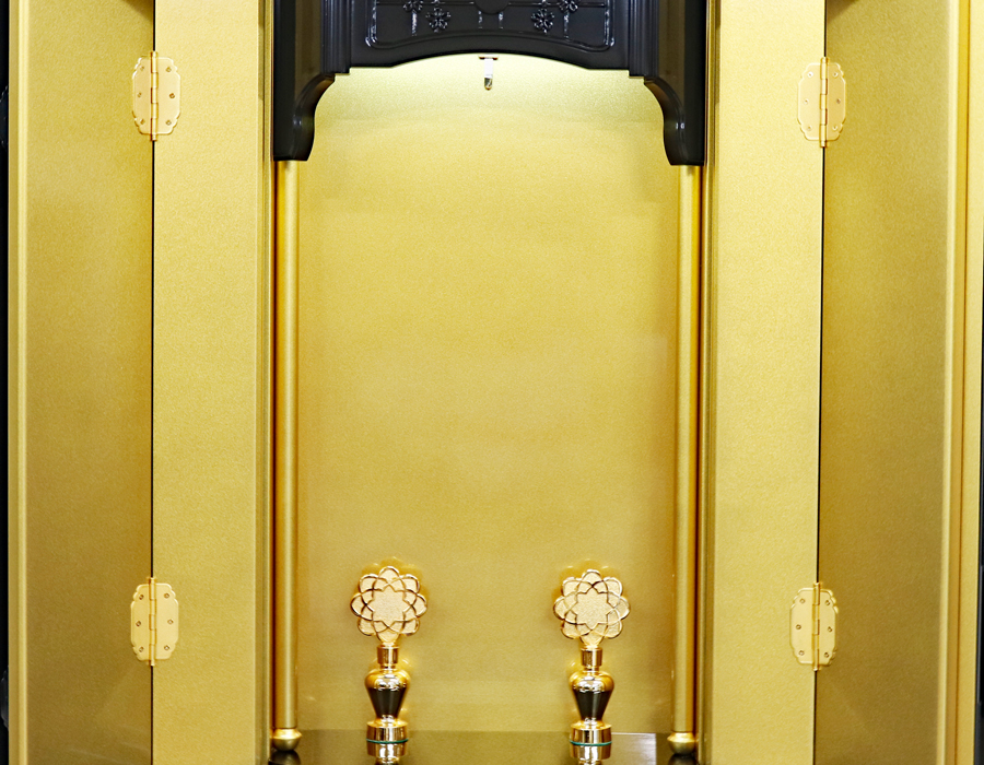 お厨子を開くと美しくクリア金色塗装の厨子板がご本尊様をさらに荘厳にしてくれます。 内部にはLED照明も新設いたしましたのでご本尊様を明るく照らしてくれます。