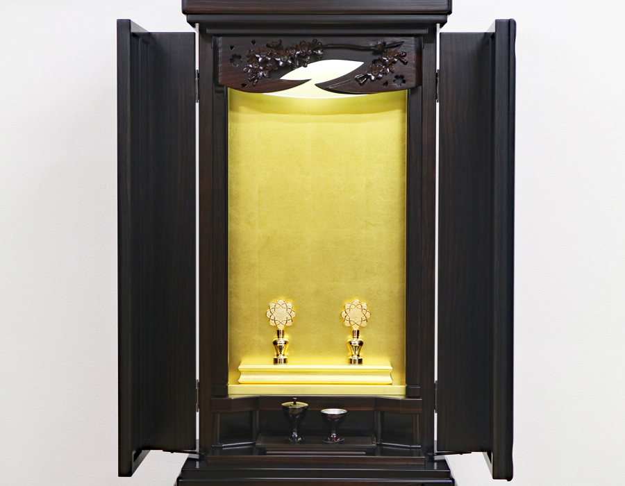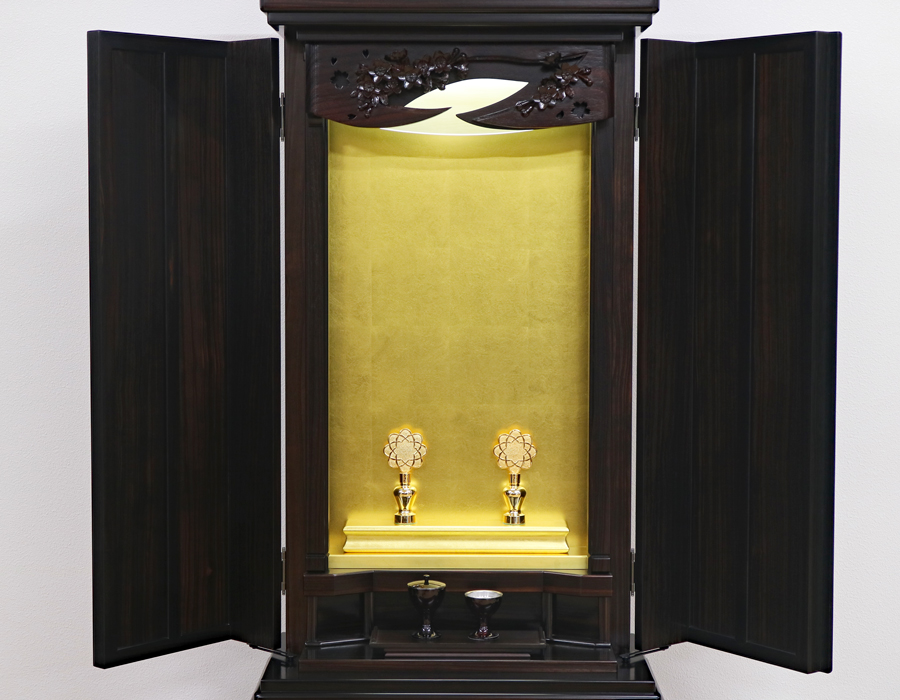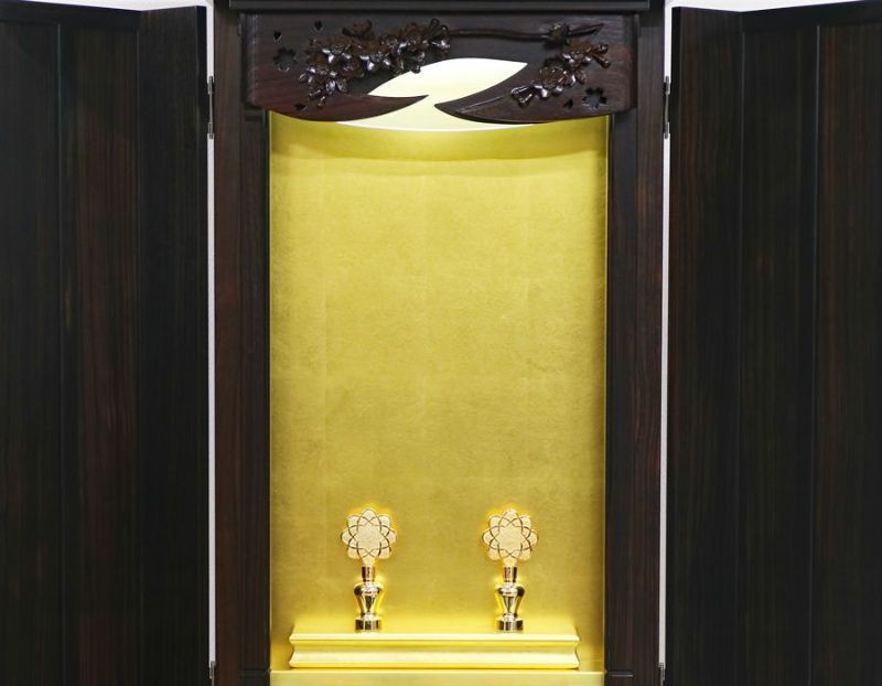 本金箔と金色塗装では輝きが違うのは一目瞭然です。 内部には蛍光灯照明も付属していますのでご本尊様を明るく照らしてくれます。