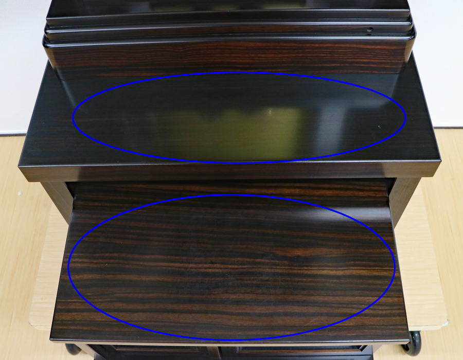 上記お写真の上の青丸(三宝置く箇所)・下の青丸の箇所(収納経机)薄い擦り傷がございます。