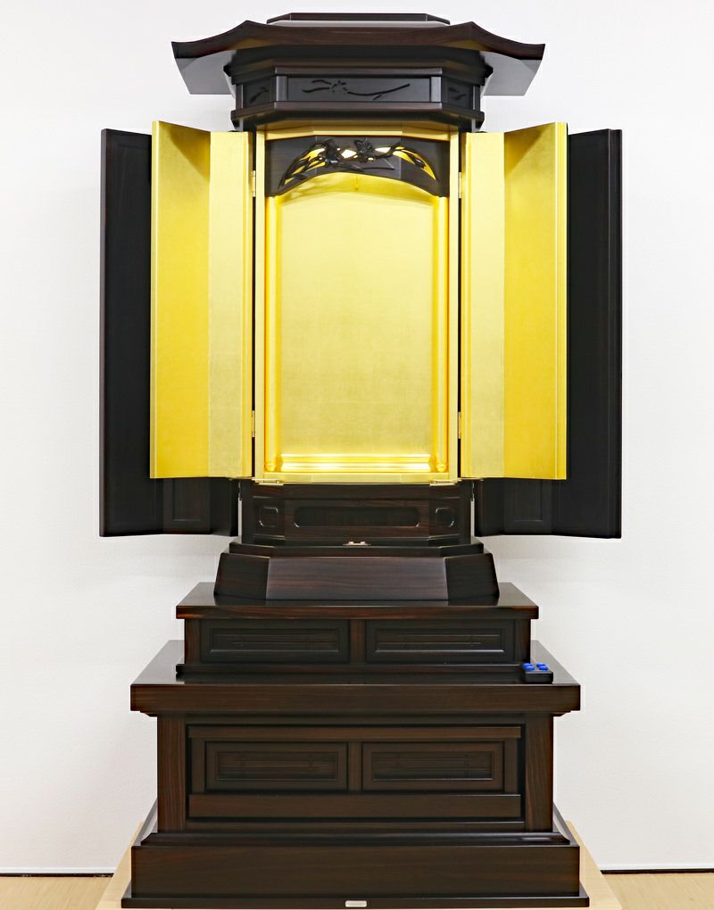 本金箔と金色塗装では輝きが違うのは一目瞭然です。 内部には蛍光灯6wの照明も付属していますのでご本尊様を明るく照らしてくれます。