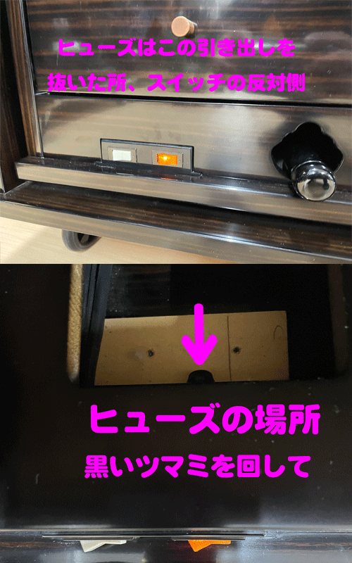 ヒューズの場所:スイッチ不具合が生じた場合は 外付け関東精機(KSK) 5ピン 丸形で交換対応になります
