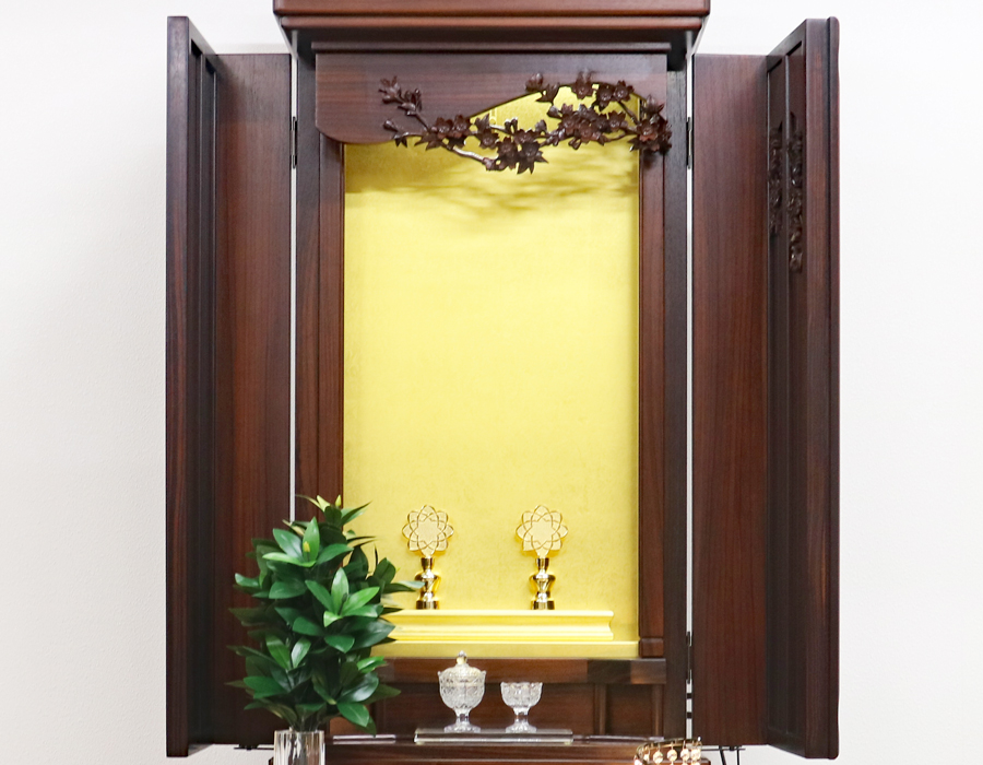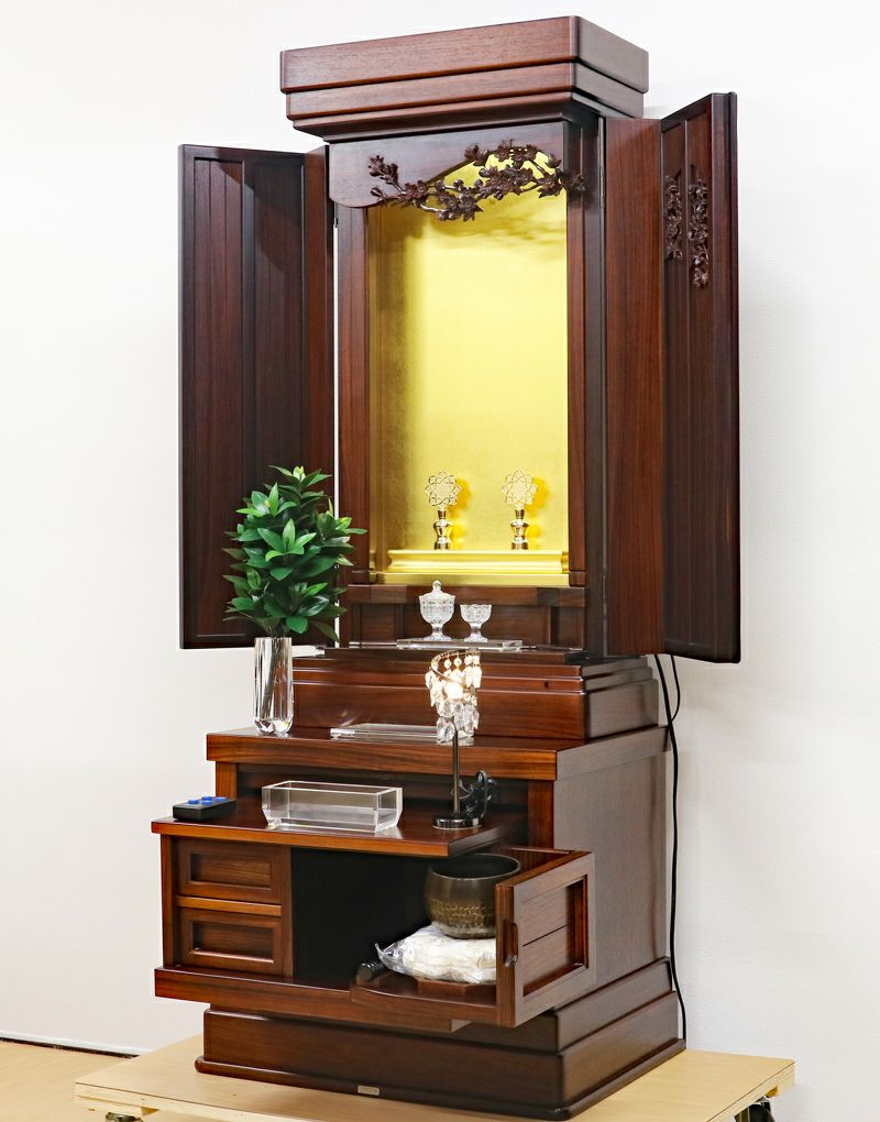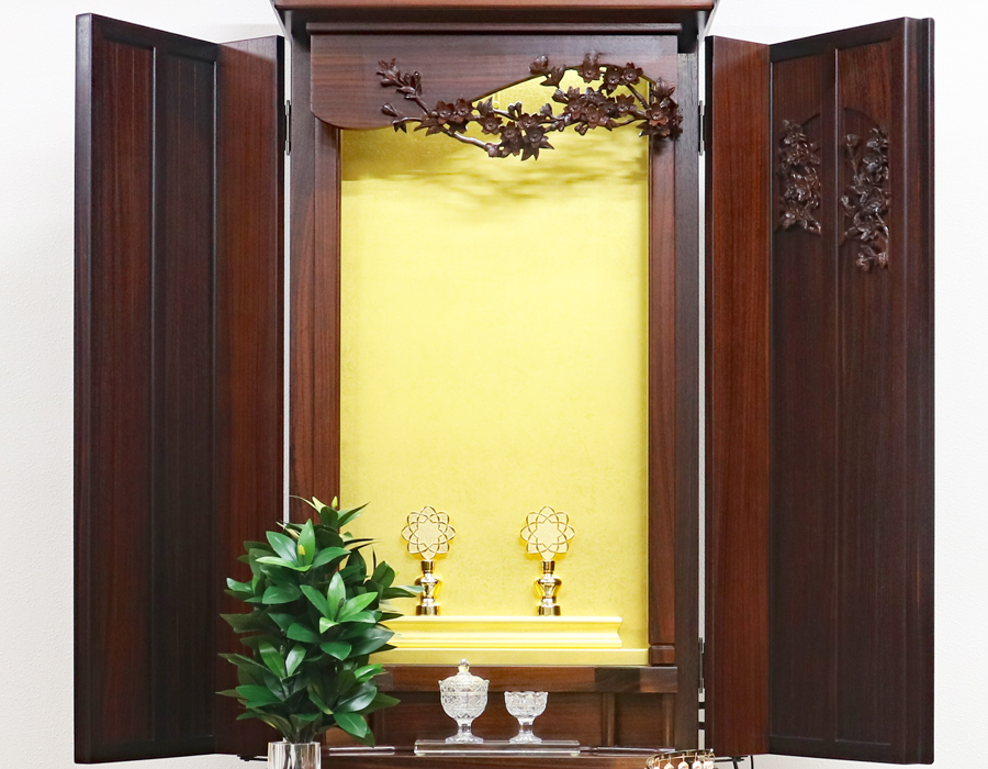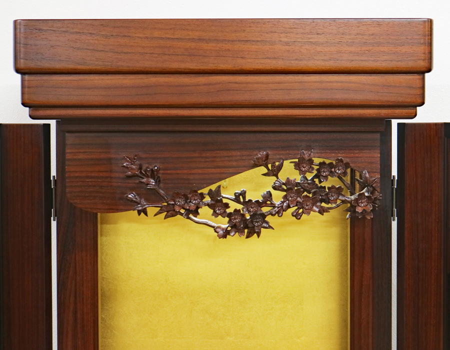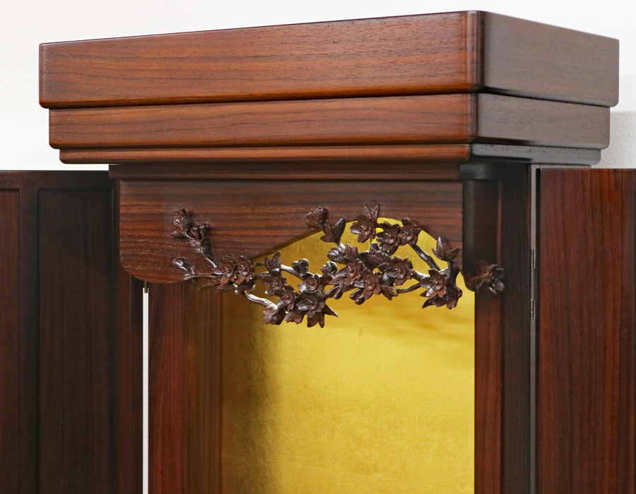 お仏壇正面右側の大戸にもソノクリン(紫檀)の無垢板をふんだんに使用して、桜模様の彫りを立体的に仕上げています。