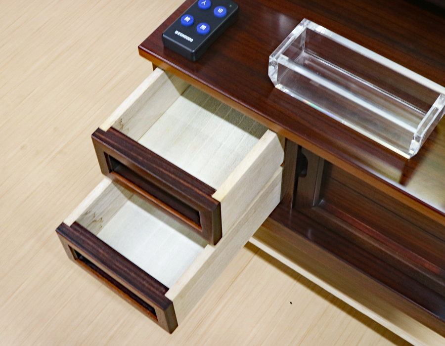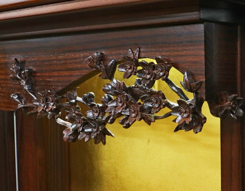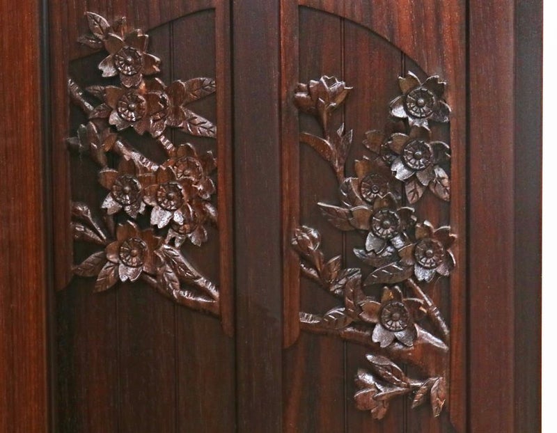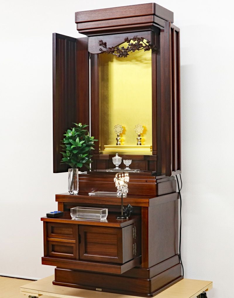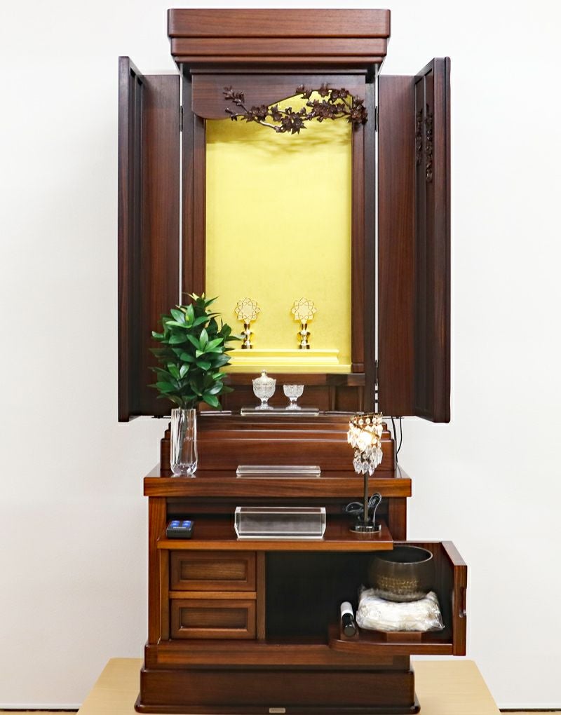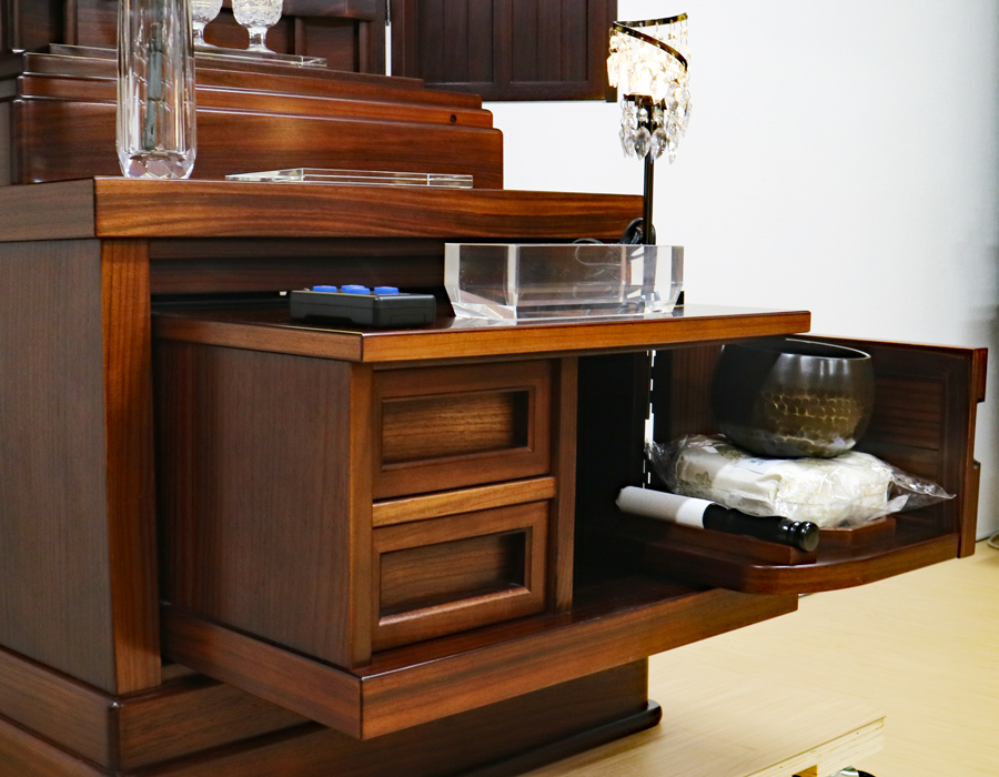 お仏壇正面右側の大戸にもソノクリン(紫檀)の無垢板をふんだんに使用して、桜模様の彫りを立体的に仕上げています。