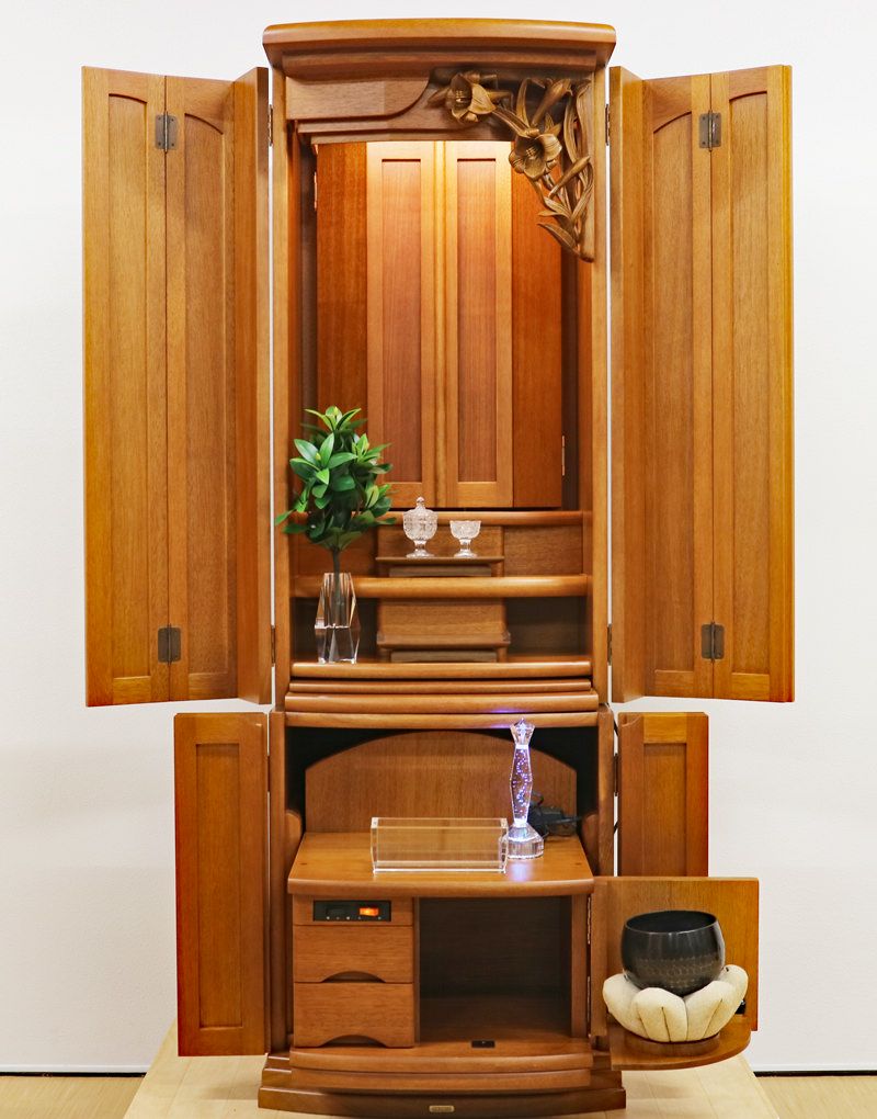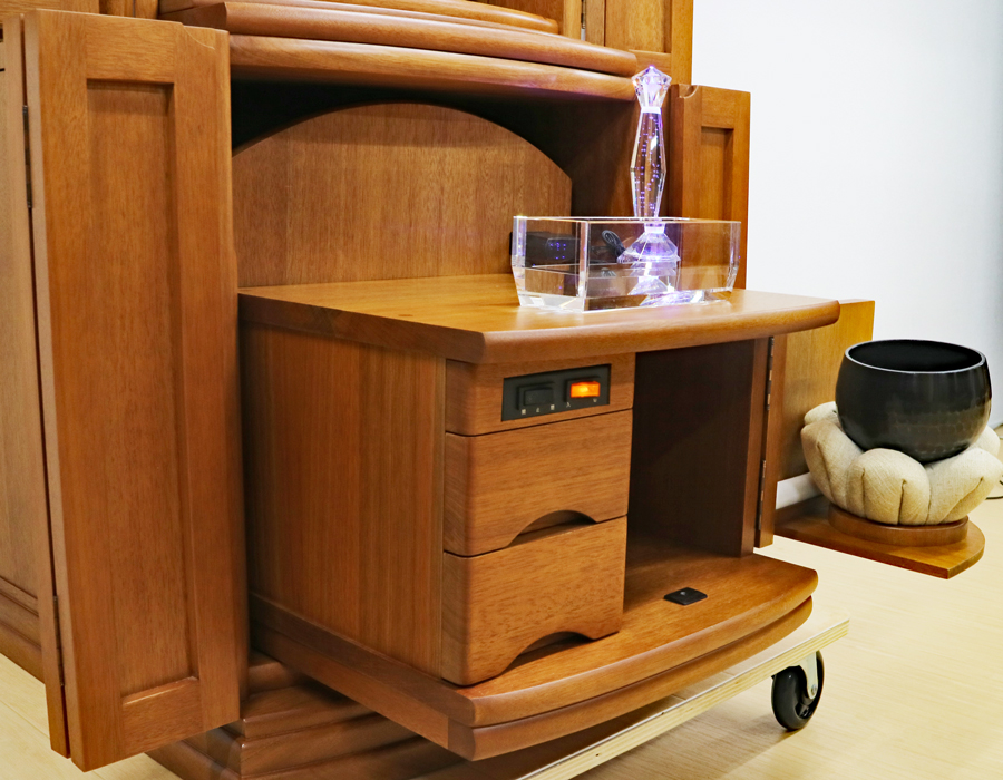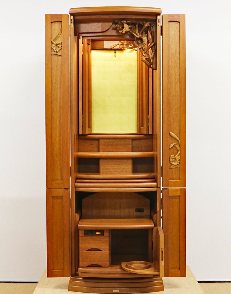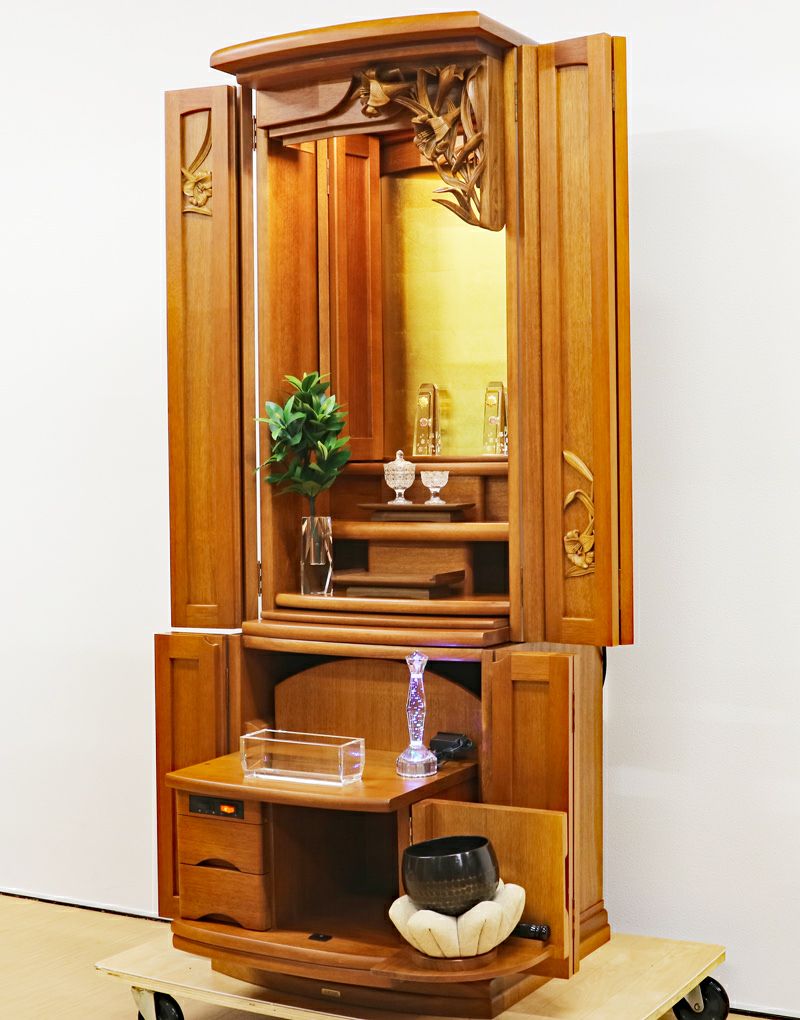 大戸が三方開きになるお仏壇ですので、三方開きにすると視野が広がり斜めからでも御本尊様を拝すことができます。