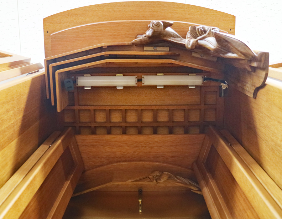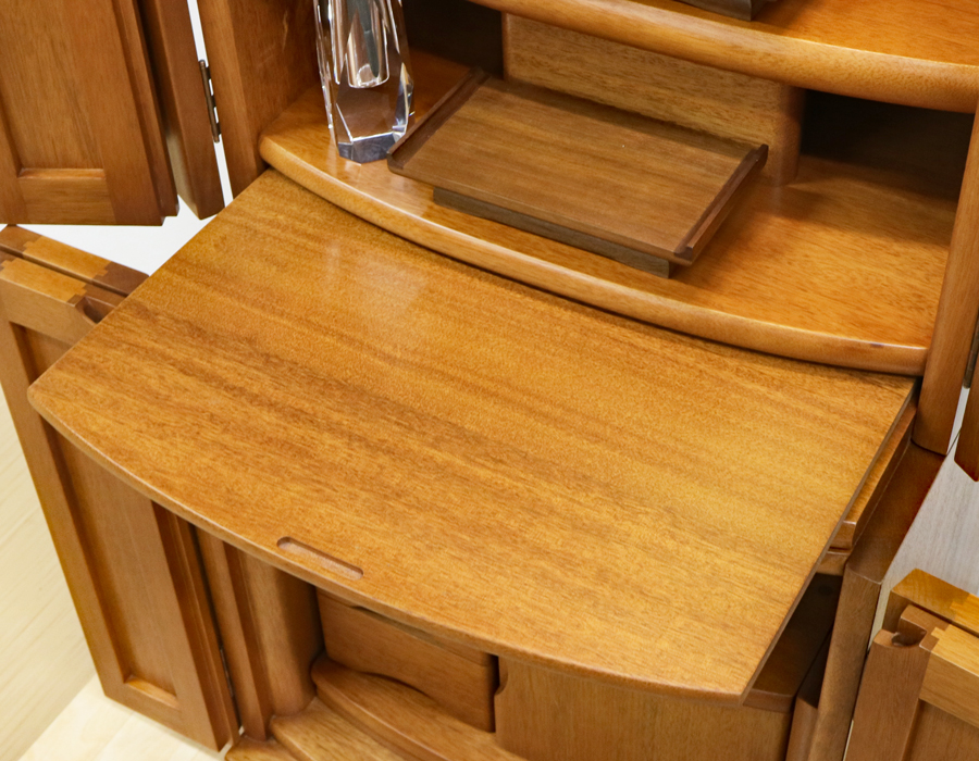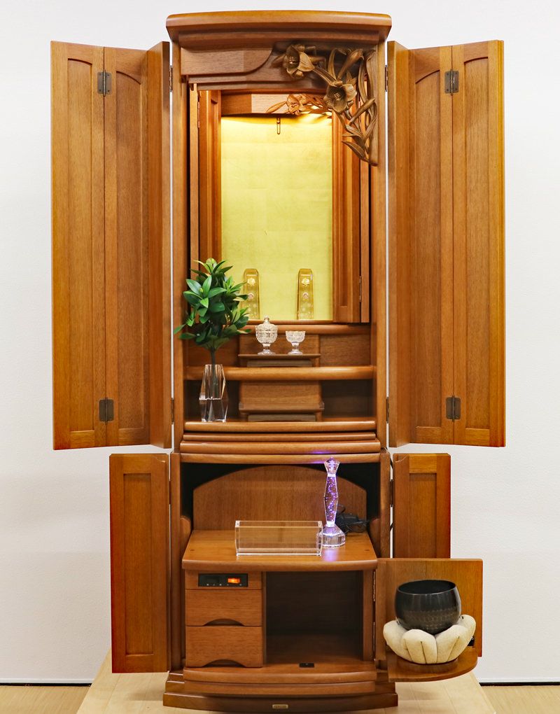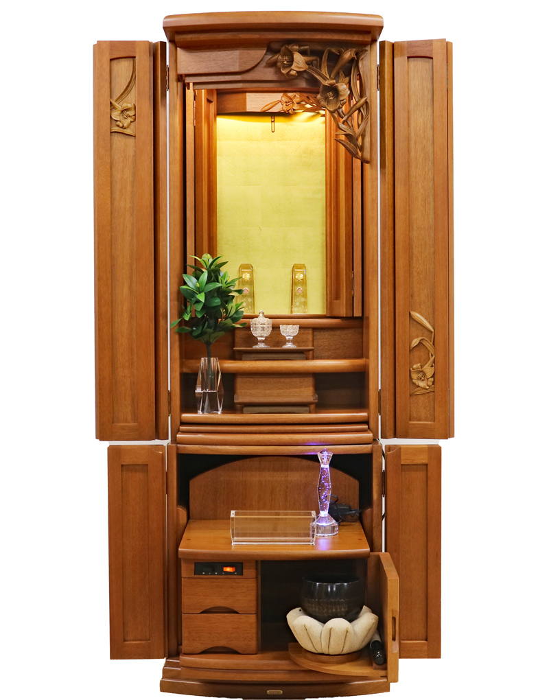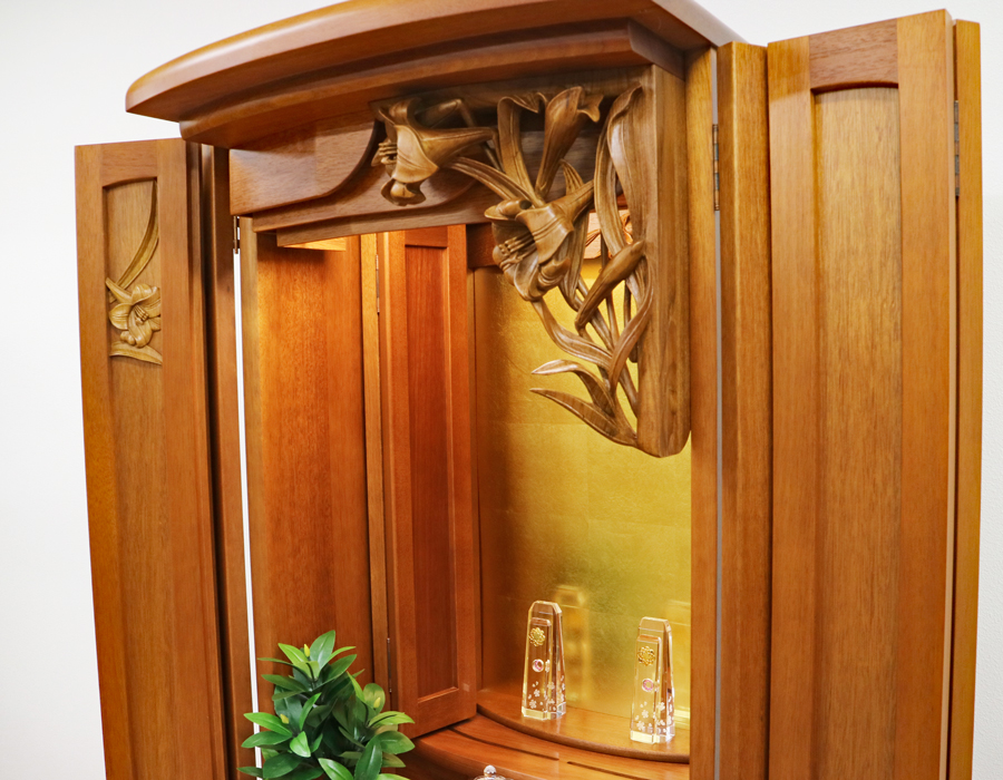 大戸が三方開きになるお仏壇ですので、三方開きにすると視野が広がり斜めからでも御本尊様を拝すことができます。