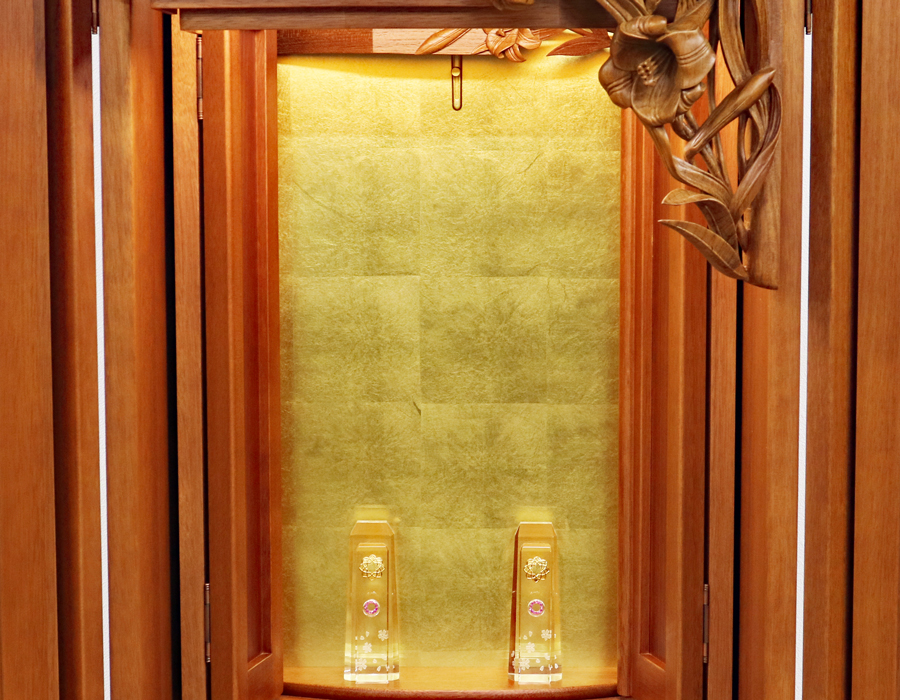 本金箔と金色塗装では輝きが違うのは一目瞭然です。 内部にはLED照明も付属していますのでご本尊様を明るく照らしてくれます。
