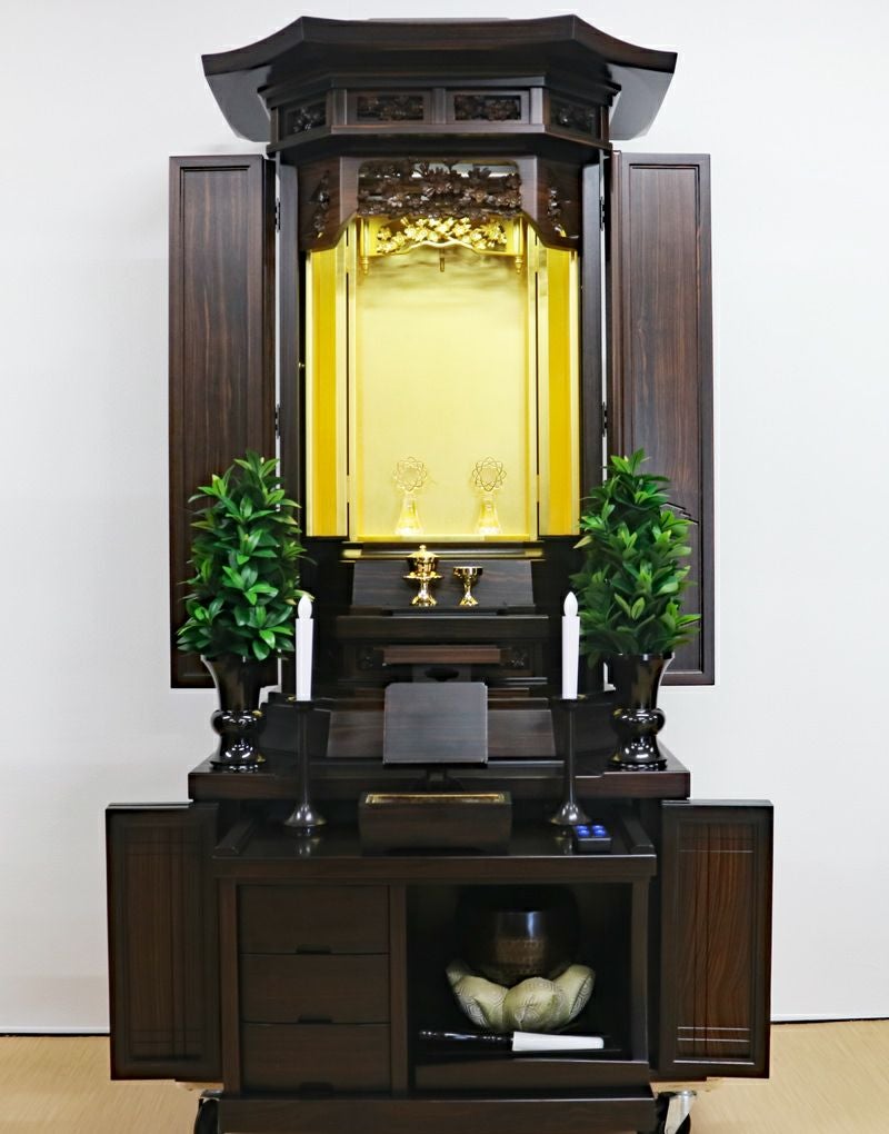 本金箔と金色塗装では輝きが違うのは一目瞭然です。 内部には蛍光灯10wの照明も付属していますのでご本尊様を明るく照らしてくれます。
