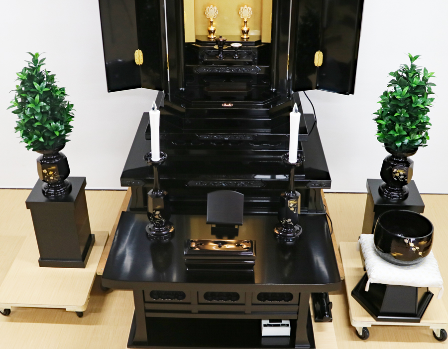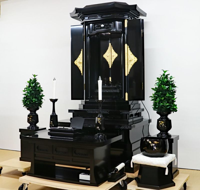 経机・花台付きの本格厨子型仏壇となります。ご不明点があればLINEでお気軽にお問い合わせくださいませ。