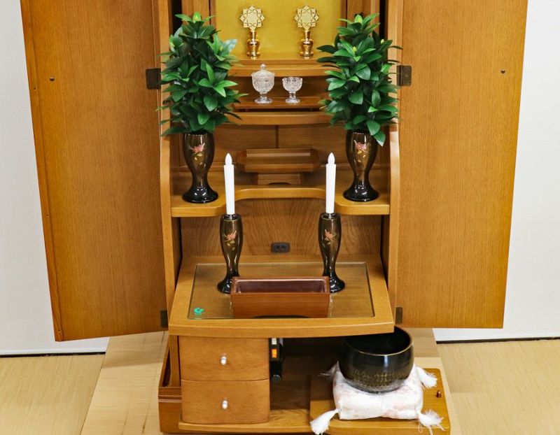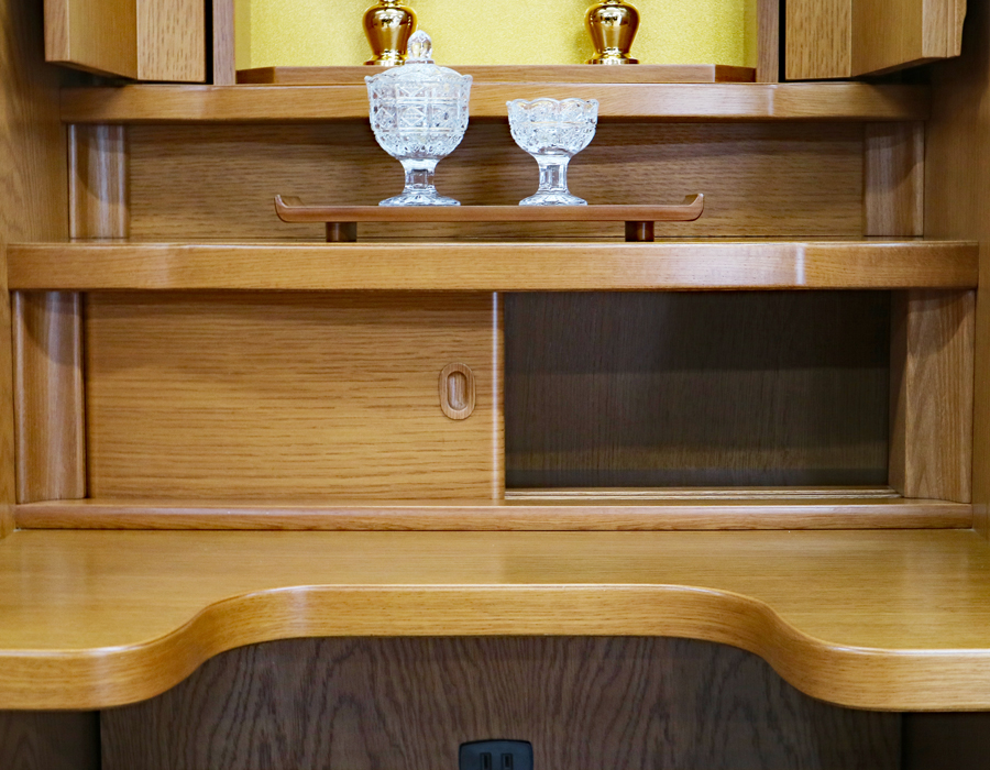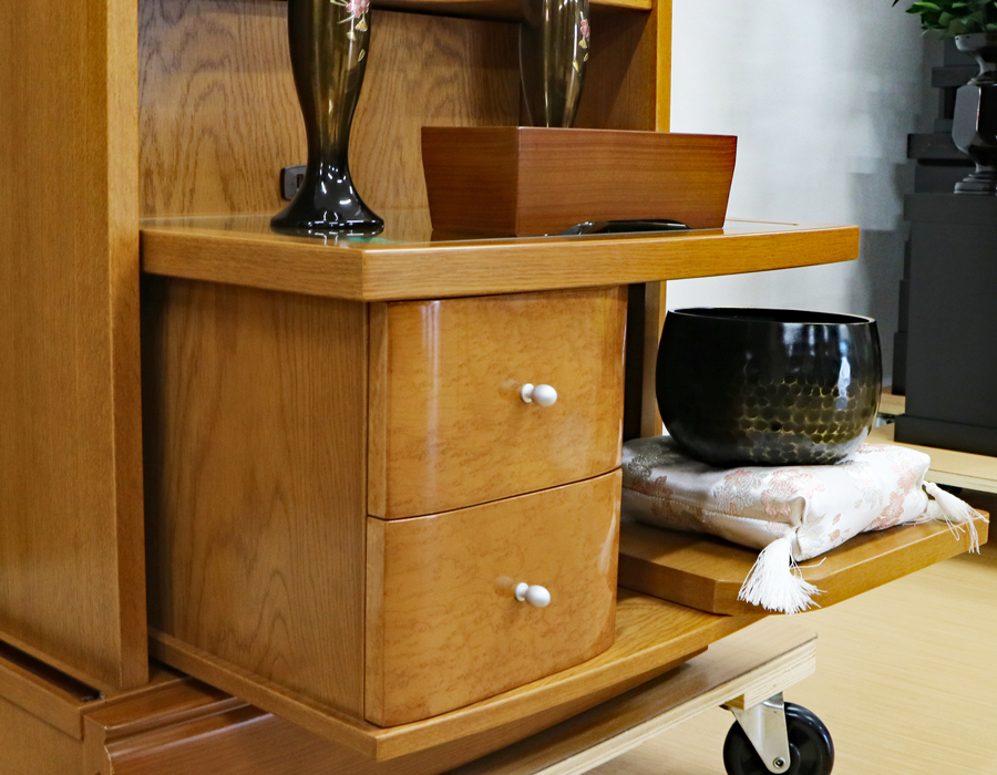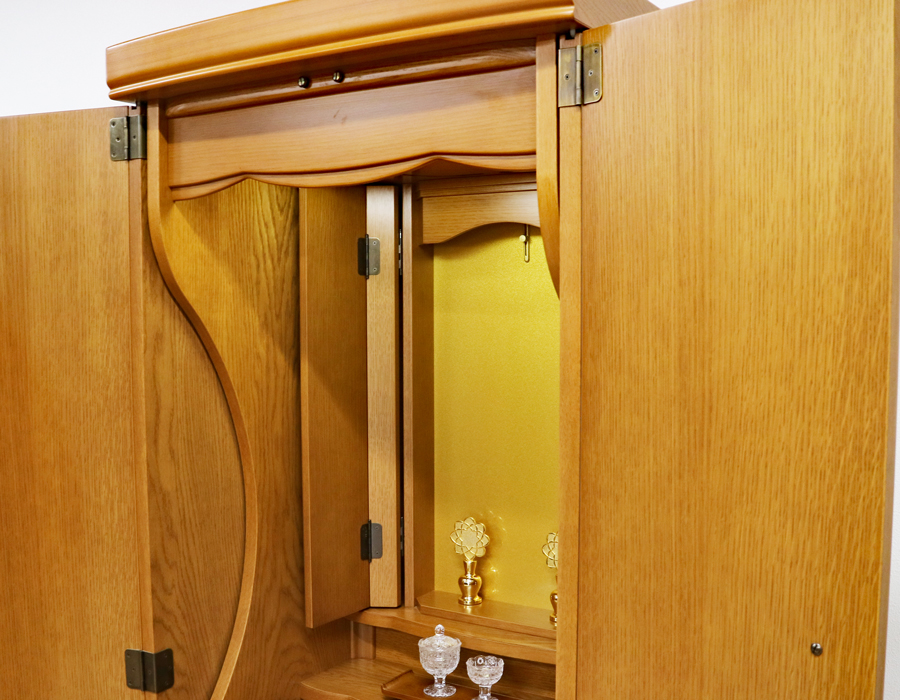 当商品は押し込み式の大戸になりますので、押し込むことによって斜めからでもご本尊様を拝すことができます。