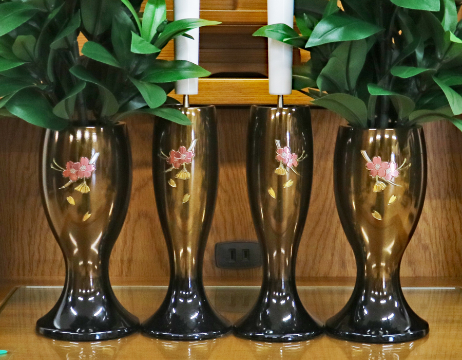 付属の灯立・花立は桜の彫金入りの高級銅器仏具になります。