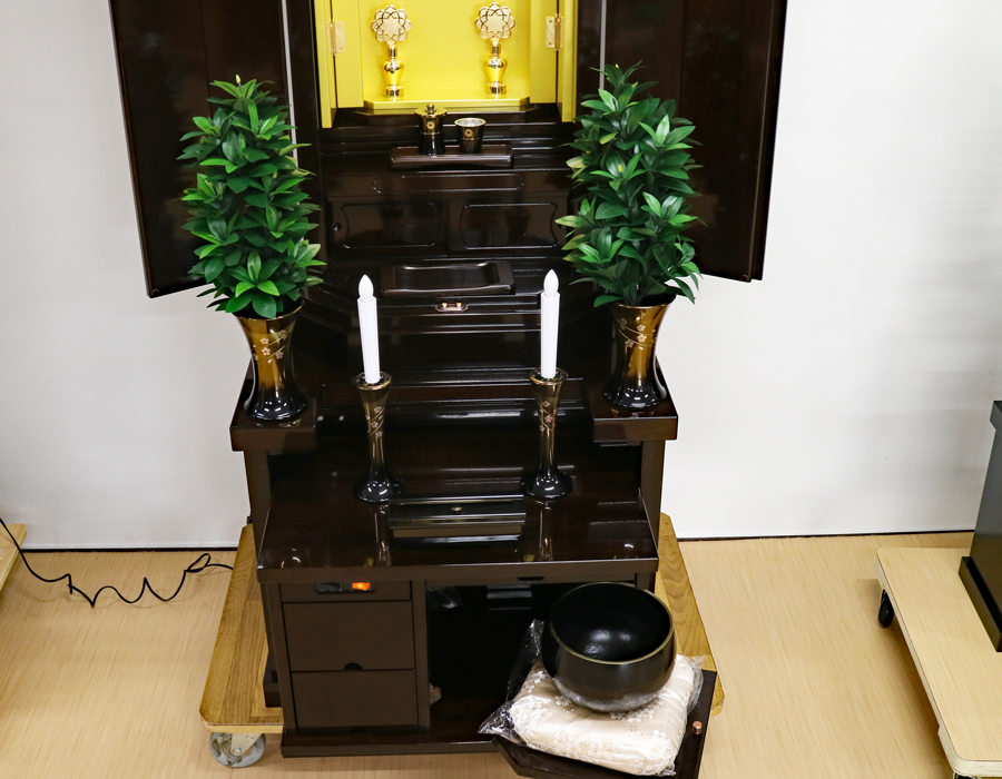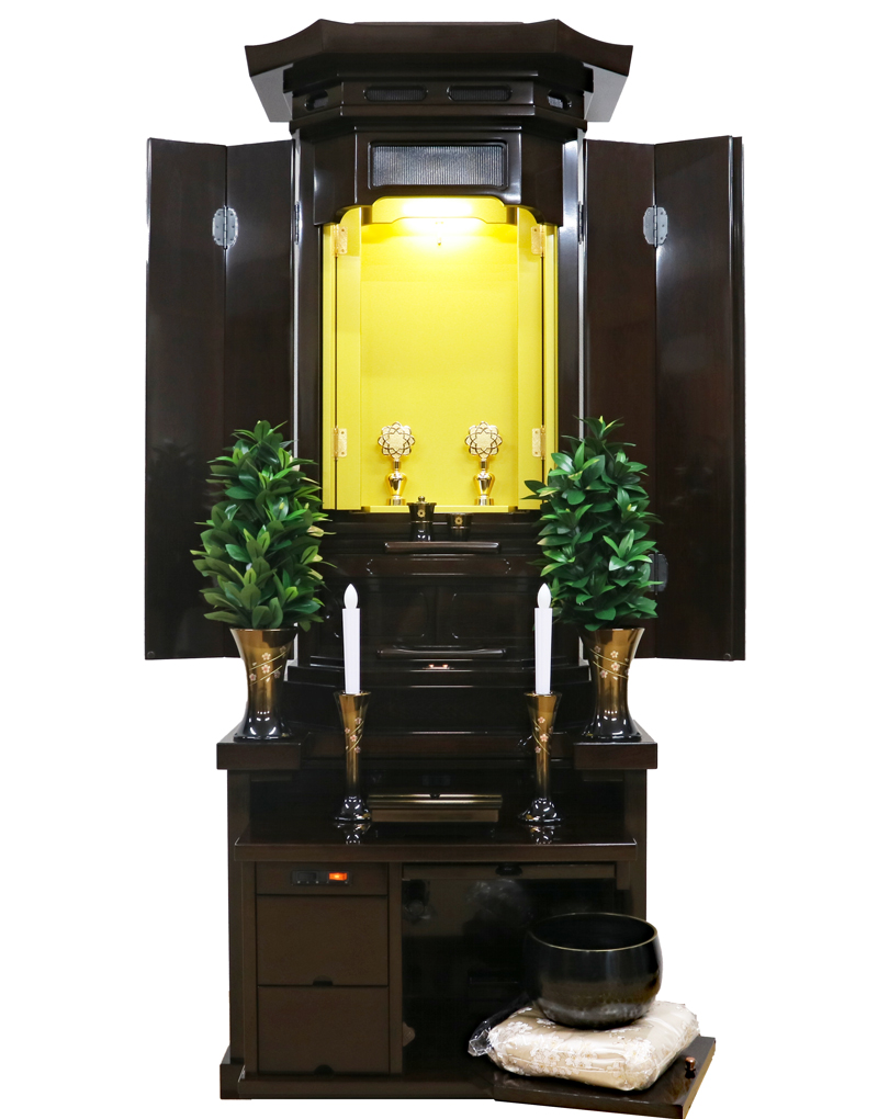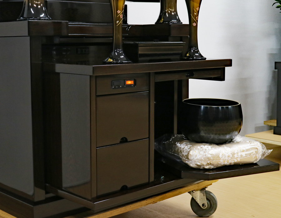 仏具付きをお選びの場合、銅器生産で有名な高岡製の桜彫金入り銅器仏具セットが付属いたします。