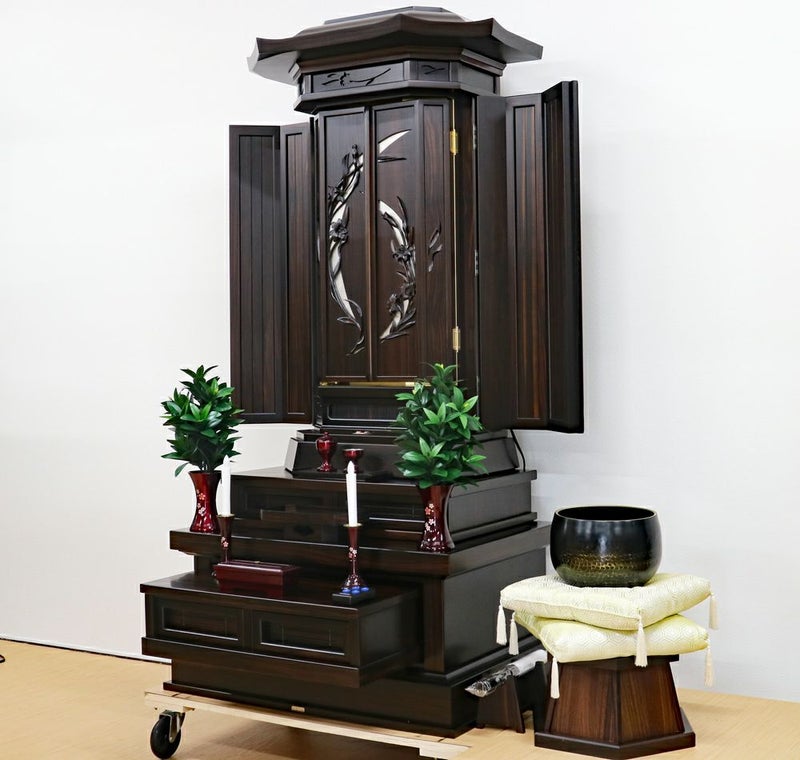 現在でも金剛堂さんにて、仏具付価格1,204,920円で販売中の「25本黒檀白ゆり」の中古仏壇です。