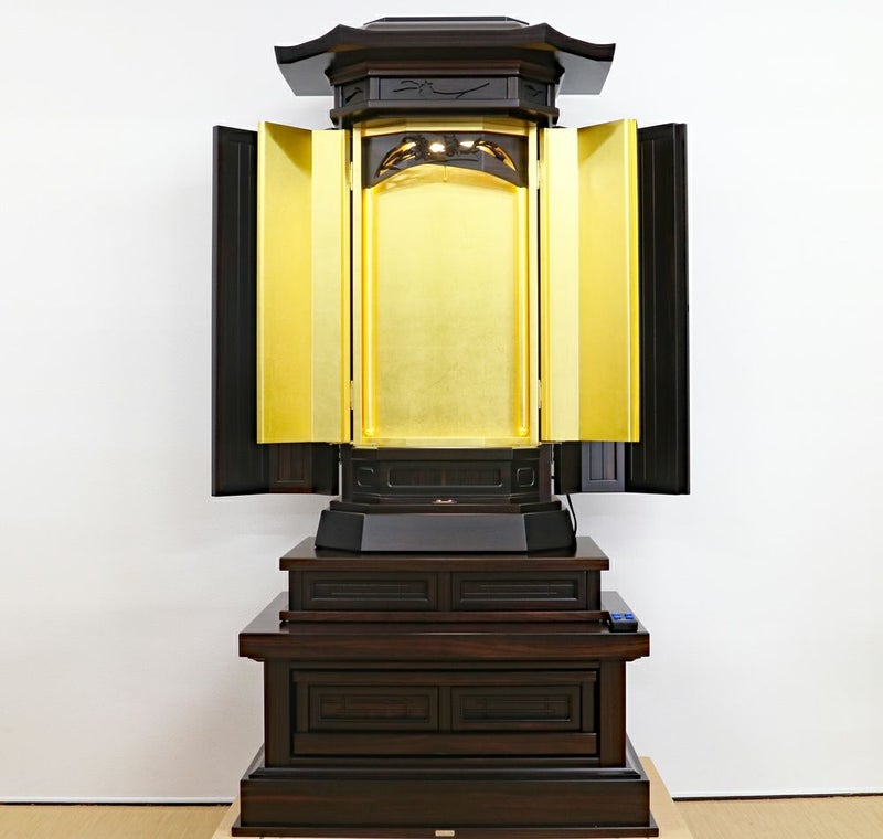 本金箔と金色塗装では輝きが違うのは一目瞭然です。 内部にはLED照明も付属していますのでご本尊様を明るく照らしてくれます。